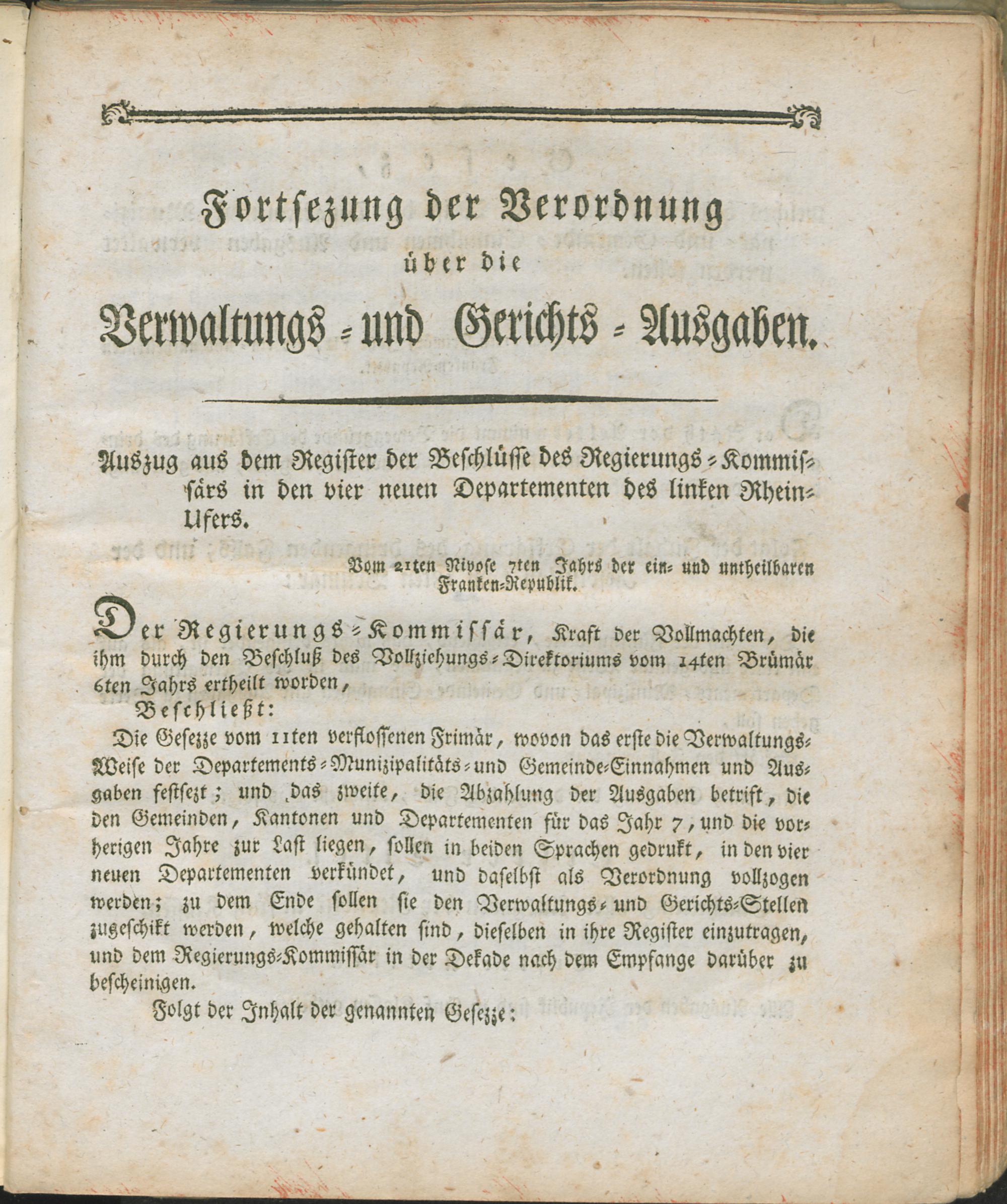 VerwGerAusg,Forts (1799) Fortsetzung der Verordnung über die Verwaltungs- und Gerichts-Ausgaben : Auszug aus dem Register der Beschlüsse des Regierungs-Kommissärs in den vier neuen Departementen des linken Rhein-Ufers ; vom 21ten Rivose 7ten Jahrs der ein- und untheilbaren Franken-Republik / [Rudler]