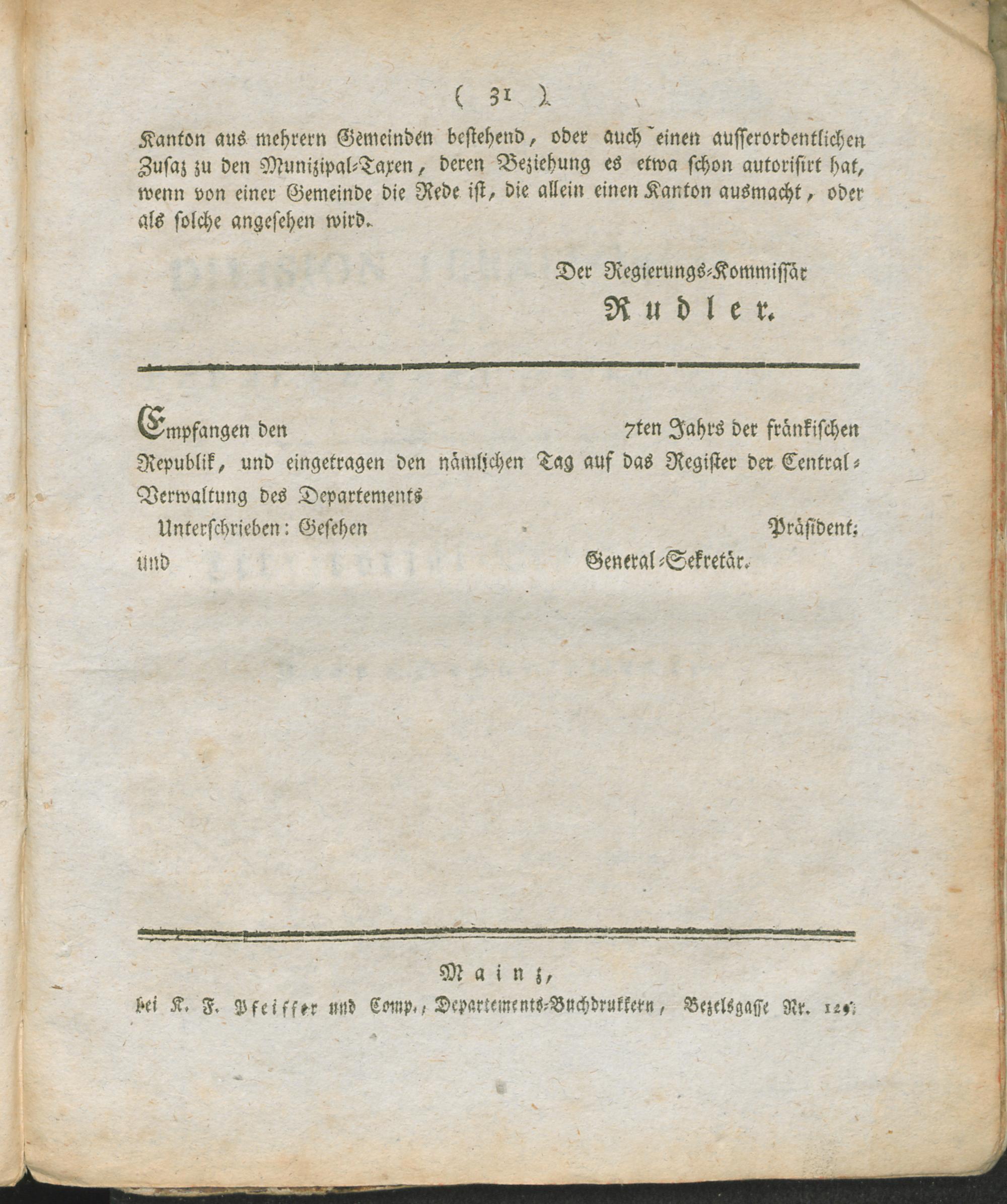 VerwGerAusg,Forts (1799) Fortsetzung der Verordnung über die Verwaltungs- und Gerichts-Ausgaben : Auszug aus dem Register der Beschlüsse des Regierungs-Kommissärs in den vier neuen Departementen des linken Rhein-Ufers ; vom 21ten Rivose 7ten Jahrs der ein- und untheilbaren Franken-Republik / [Rudler]