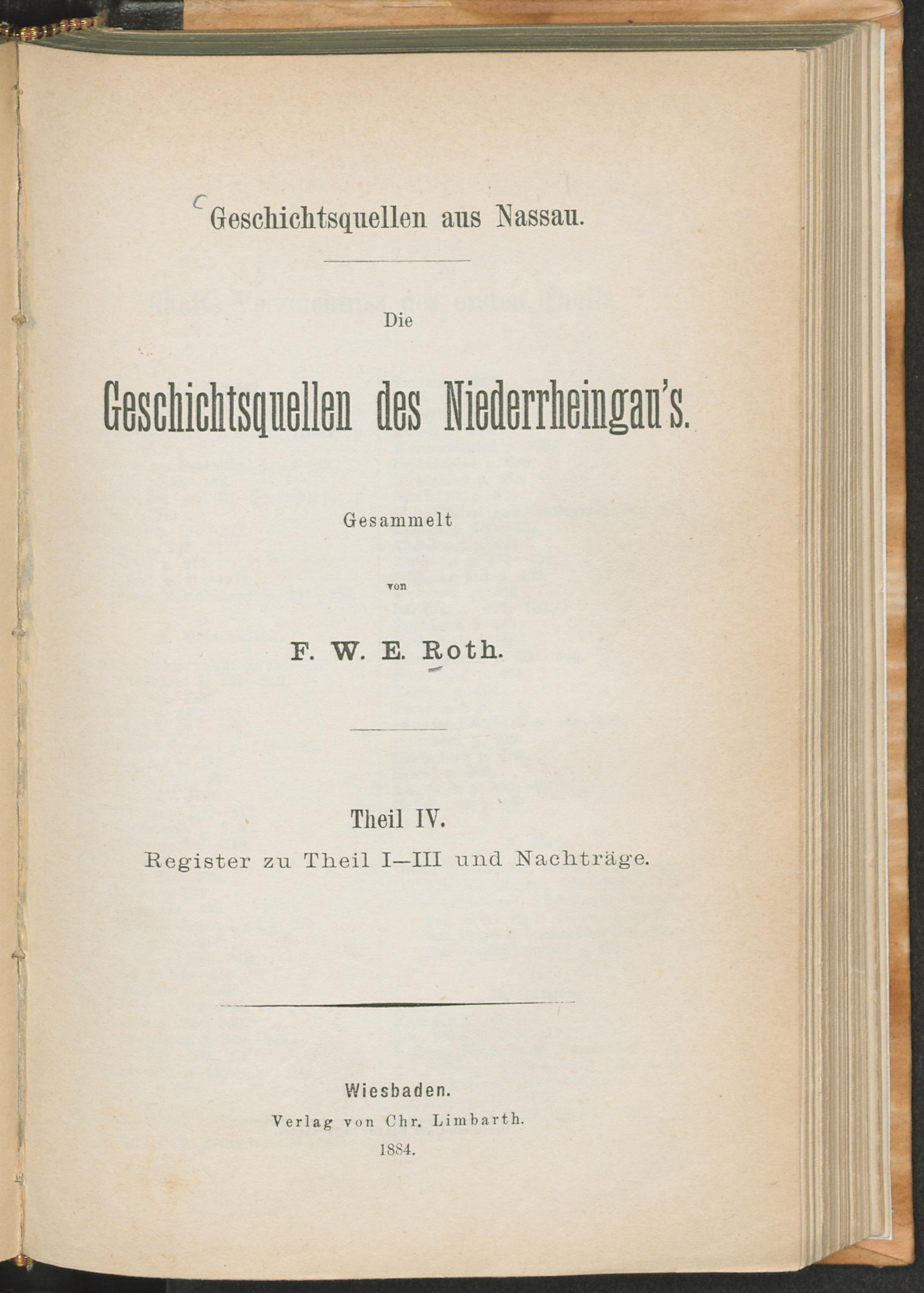 1,4 (1884) Die Geschichtsquellen des Niederrheingau's : 4. Register zu Theil I - III und Nachträge / gesammelt von F. W. E. Roth