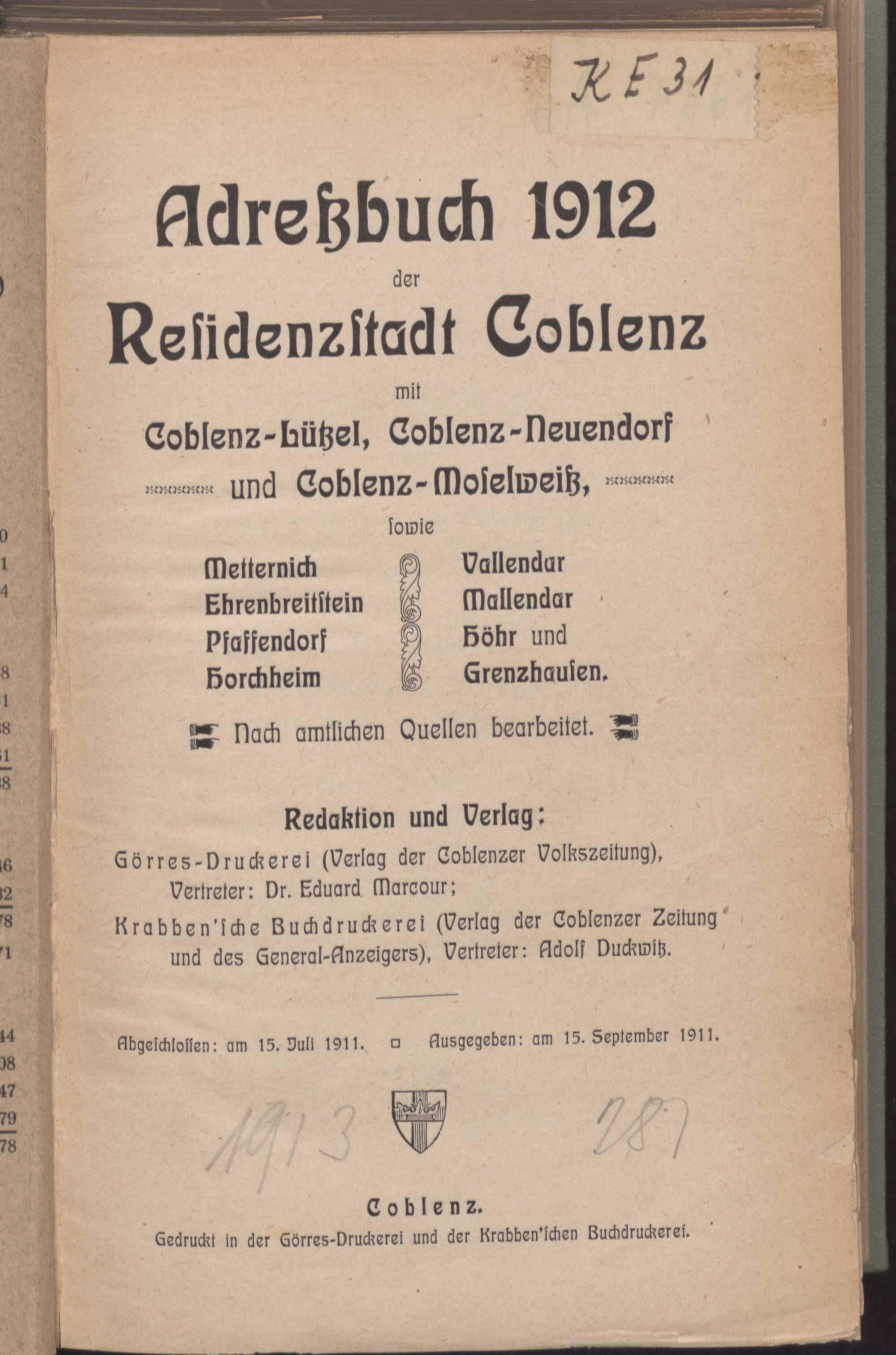 Adreßbuch ... der Residenzstadt Coblenz : mit Coblenz-Lützel, Coblenz-Neuendorf, und Coblenz-Moselweiß sowie Metternich, Ehrenbreitstein, Pfaffendorf, Horchheim, Vallendar, Mallendar, Höhr und Grenzhausen ; nach amtlichen Quellen bearb