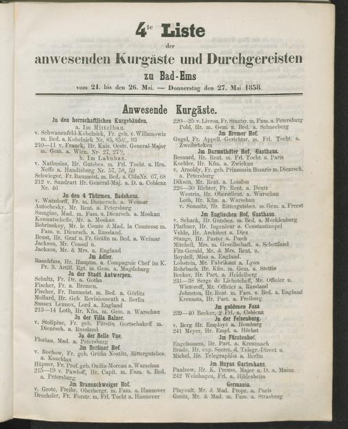 4te Liste der anwesenden Kurgäste und Durchgereisten zu Bad-Ems vom 21. bis den 26....