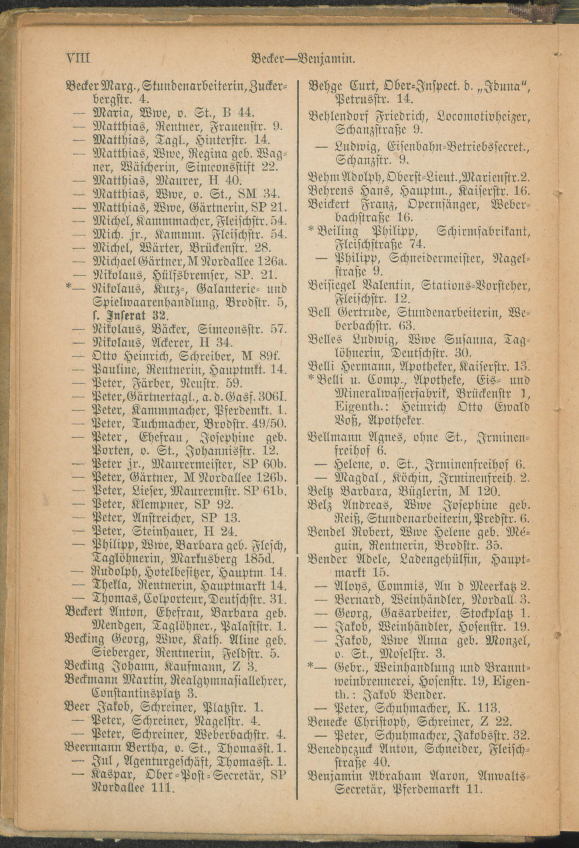 Alphabetisches Verzeichniß der Einwohner und der in das Handelsregister eingetragenen Firmen von Trier, sowie der Geschäftsleute, Handwerker und Hauseigenthümer der Vororte.