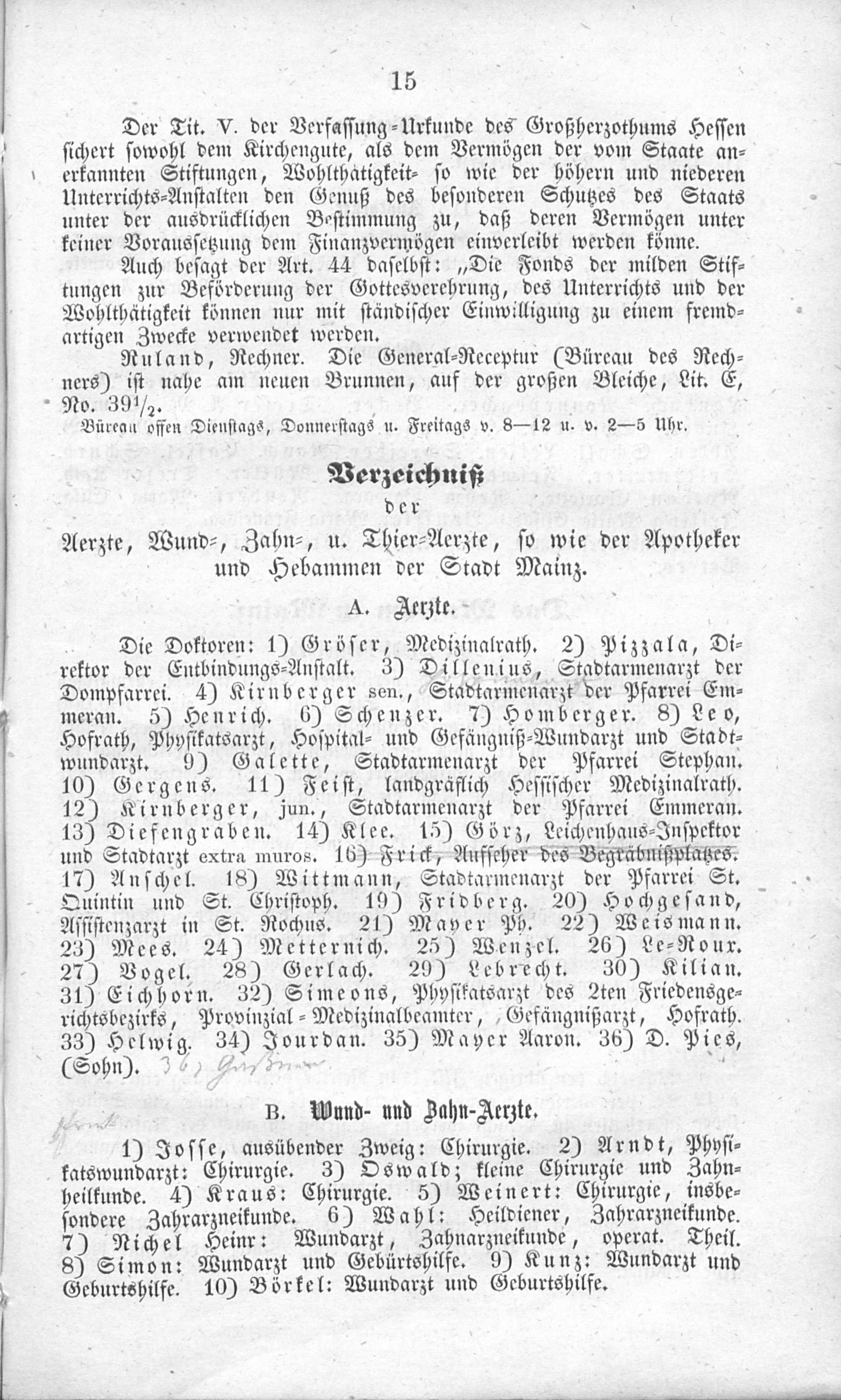 Verzeichniß der Aerzte, Wund-, Zahn-, u. Thier-Aerzte, so wie der Apotheker und Hebammen der Stadt Mainz