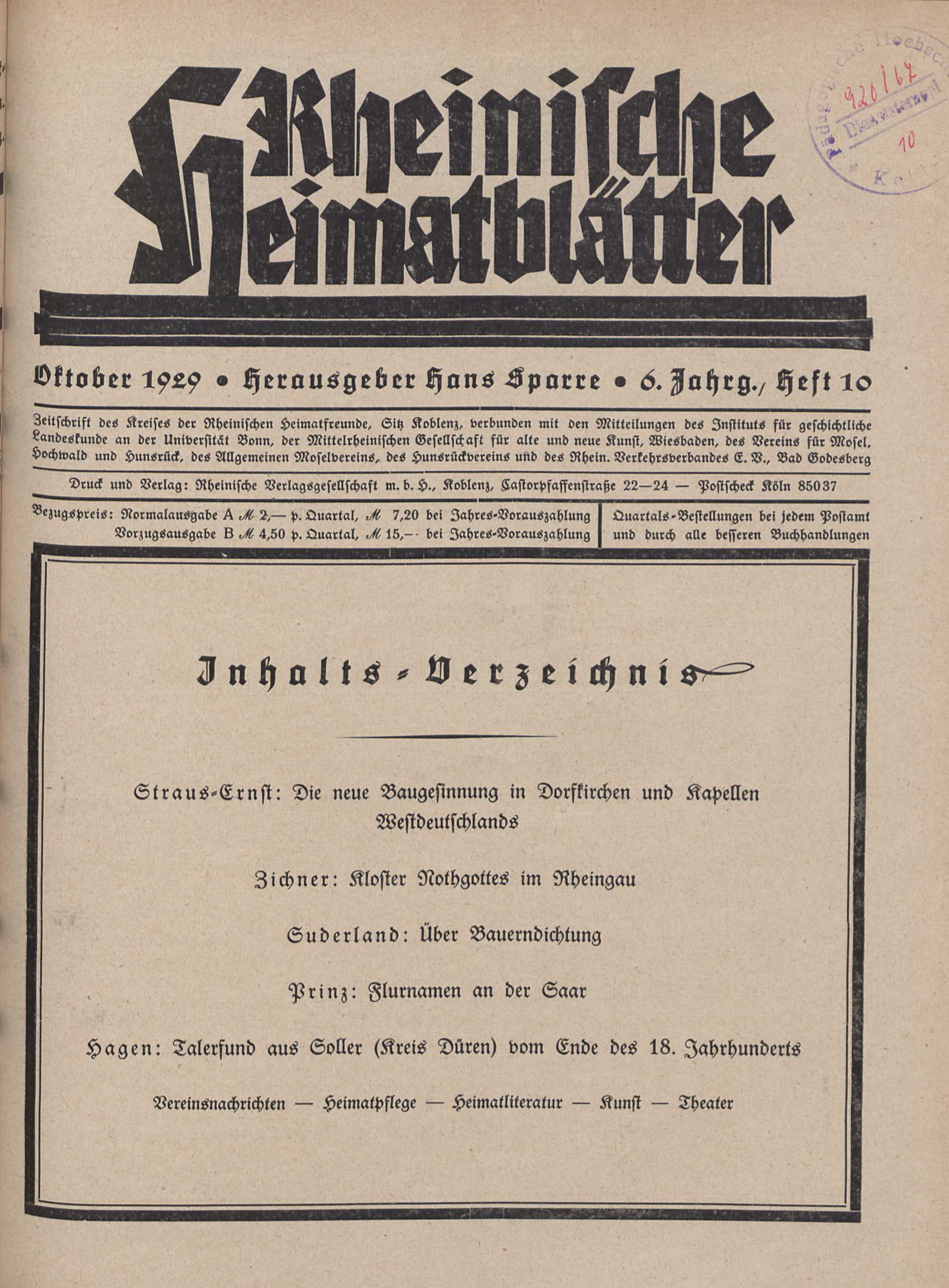 Rheinische Heimatblätter : Zeitschrift des Kreises der Rheinischen Heimatfreunde, Sitz Koblenz, verbunden mit den Mitteilungen des Instituts für Geschichtliche Landeskunde an der Universität Bonn, der Mittelrheinischen Gesellschaft für Alte und Neue Kunst, Wiesbaden, des Vereins für Mosel, Hochwald und Hunsrück, des Allgemeinen Moselvereins, des Hunsrückvereins und des Rhein. Verkehrsverbandes e.V., Bad Godesberg