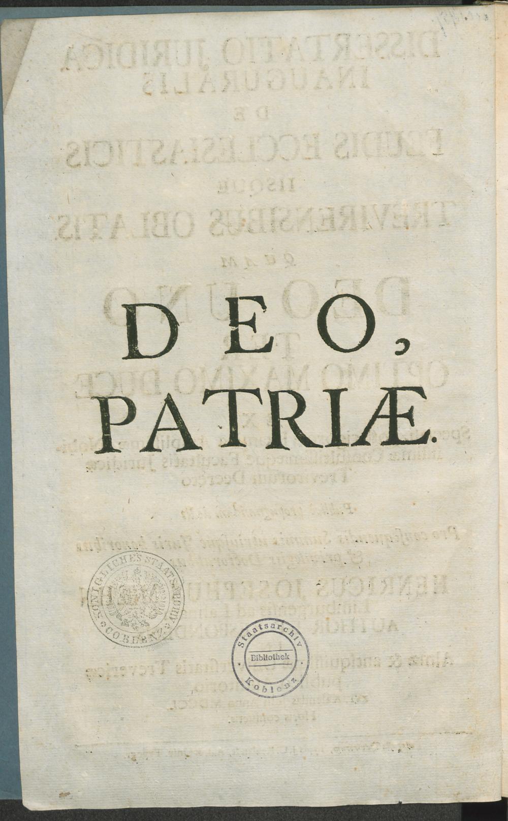 Dissertatio Juridica Inauguralis De Feudis Ecclesiasticis Iisque Trevirensibus Oblatis / Quam optimo maximo duce ex speciali, post rigorosa Examina Amplissimae, Nobilissimae Consultissimaeque Facultatis Juridicae Trevirorum Decreto Publicè propugnandam dedit ... Henricus Josephus Moehn ... Author Et Respondens ...