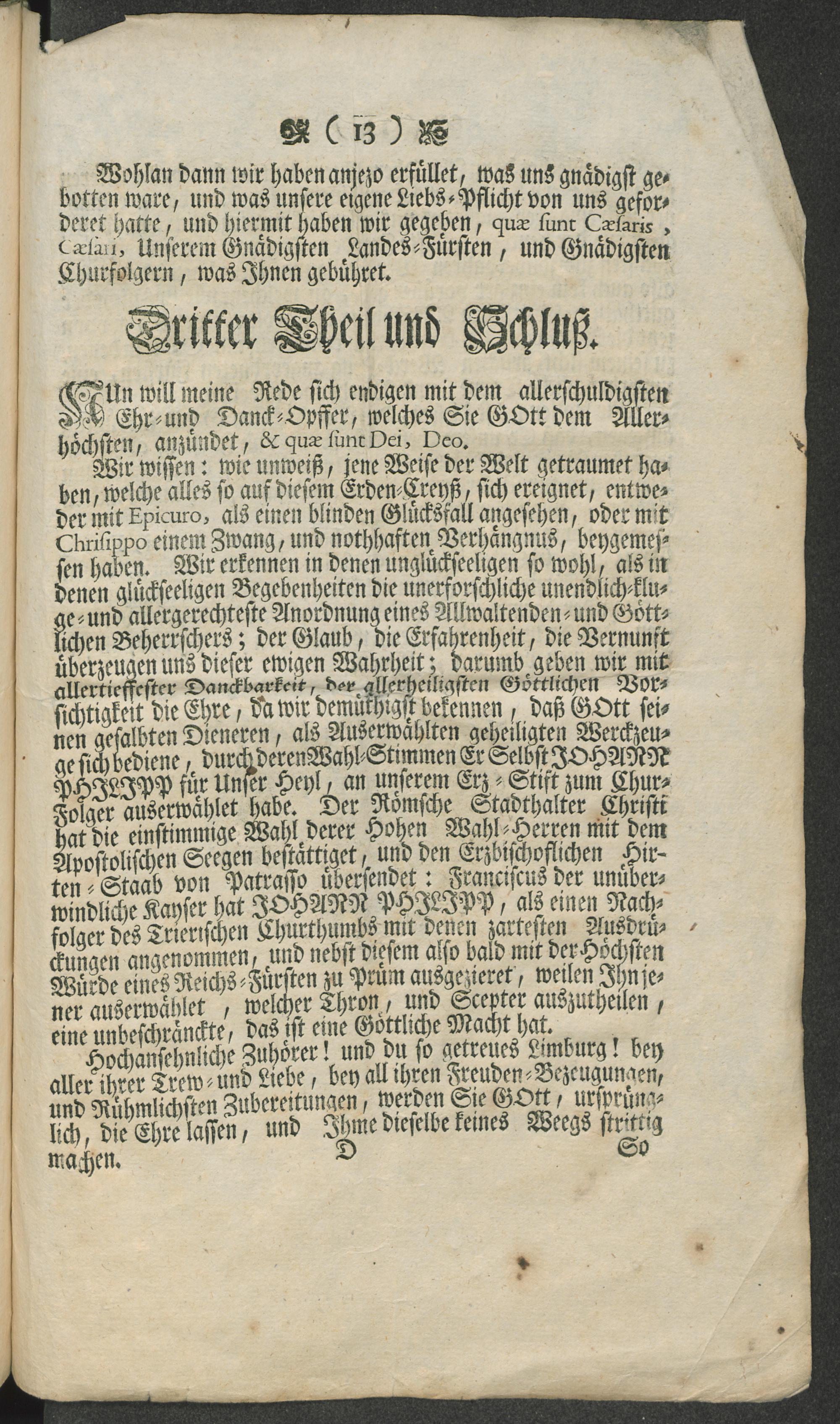 Schuldigste deme Allerhöchsten Gott abgelegte Lob- und Danck-Rede : Bey feyerlich vorgegangener Abkündigung Des von Ihro Churfürstlichen Gnaden Unserem Hochwürdigsten Erz-Bischofen An alle Städt, Aemteren und Ortschaften, des gantzen Hohen Erz-Stifts Trier, unterm 7. Novembris 1754. gerichteten Höchsten Befehls ; Kraft wessen Ihro Hochfürstliche Gnaden Hr. Joahnn Philipp ... Coadjutor der Hohen Erz-Stifts Trier, und Erz-Bischof zu Patrasso für Höchtderoselben rechtmässigen Nachfolger am Erz-Stift Trier, öffentlich erklähret worden. Bey zahlreich versambleten Zuhöreren ... In der Stifts- und Pfarr-Kirchen zu Limburg Vorgetragen / von F.L. Janny