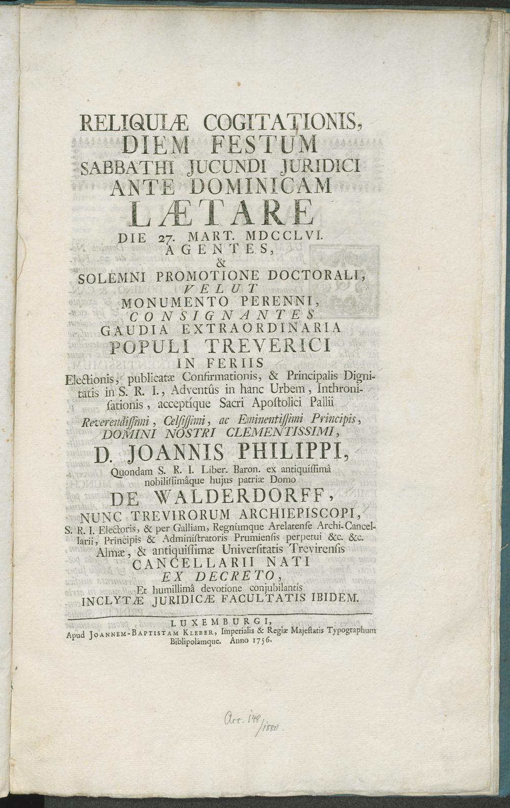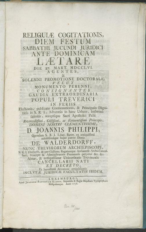 Reliquiae Cogitationis Diem Festum Sabbathi Jucundi Juridici Ante Dominicam Laetare Die 27. Mart. MDCCLVI. Agentes, & Solemni Promotione Doctorali, Velut Monumento Perenni, Consignantes Gaudia Extraordinaria Populi Treverici in Feriis ... Domini Nostri Clementissimi, D. Joannis Philippi ... De Walderdorff, Nunc Trevirorum Archiepiscopi ... Almae, & antiquissimae Universitatis Trevirensis Cancellarii Nati Ex Decreto, Et humillimâ devotione conjubilantis Inclytae Juridicae Facultatis, Ibidem