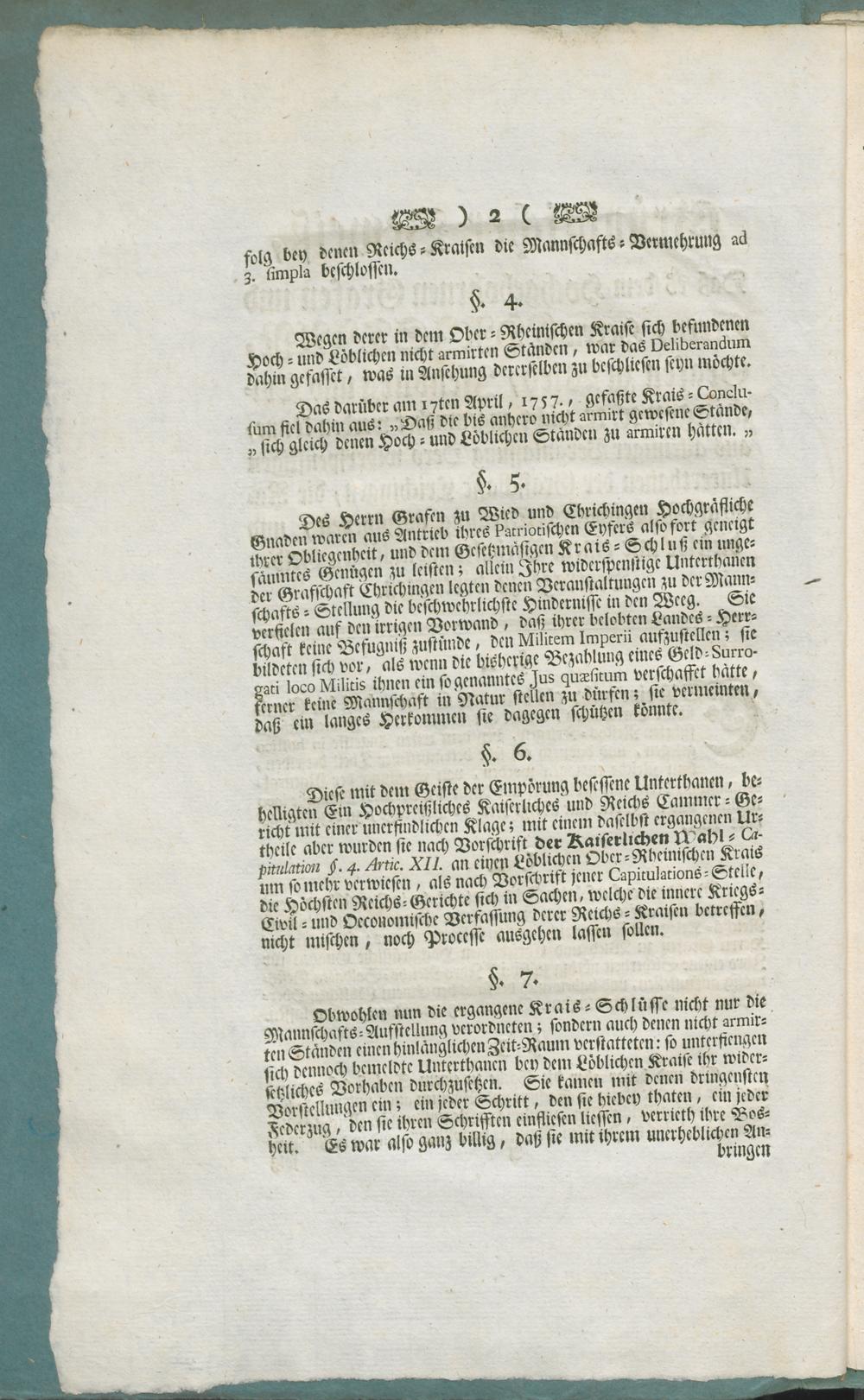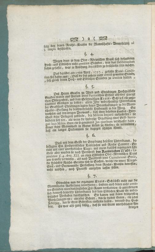 Gründlicher Beweiß, Daß es dem Hochgebohrnen Grafen und Herrn, Herrn Christian Grafen zu Wied, Isenburg und Crichingen ... nicht angemuthet werden könne, aus alleiniger Veranlassung Dero widerspenstigen Unterthanen der Graffschafft Crichingen, die Natural-Mannschaffts-Stellung aufzuheben und dieselbe mit einem Verhaltungsmäßigen Geld-Beytrage zu vertretten