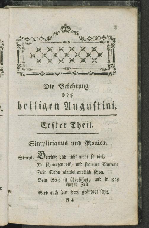 Die Bekehrung des heiligen Augustini : eine geistliche Geschichte in einem Gedicht musikalisch aufgeführt zur Fastenzeit an dem Durchlauchtigsten Erzbischöfl. und kurfürstlichen Hofe von Trier / [die Musik ist von ... Johann Adolph Hassen]