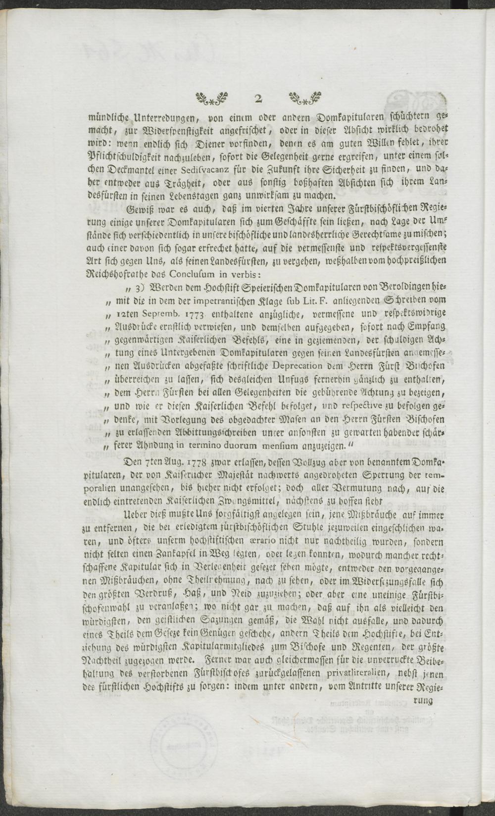 Von Gottes Gnaden Wir August Bischof zu Speier, Probst der gefürsteten Probstei Weisenburg, des Heiligen Römischen Reichs Fürst, Graf von Limburg Stirum ... Wir haben zwar bereits den verschiedenen Klassen unserer Geistlichkeit sowohl, als insbesondere unserer weltlichen Dienerschaft ... einen kurzen Inbegrif ihrer Dienstpflichten vor Augen gelegt ... : [Bruchsal den 10ten des Herbstmonates 1781.]
