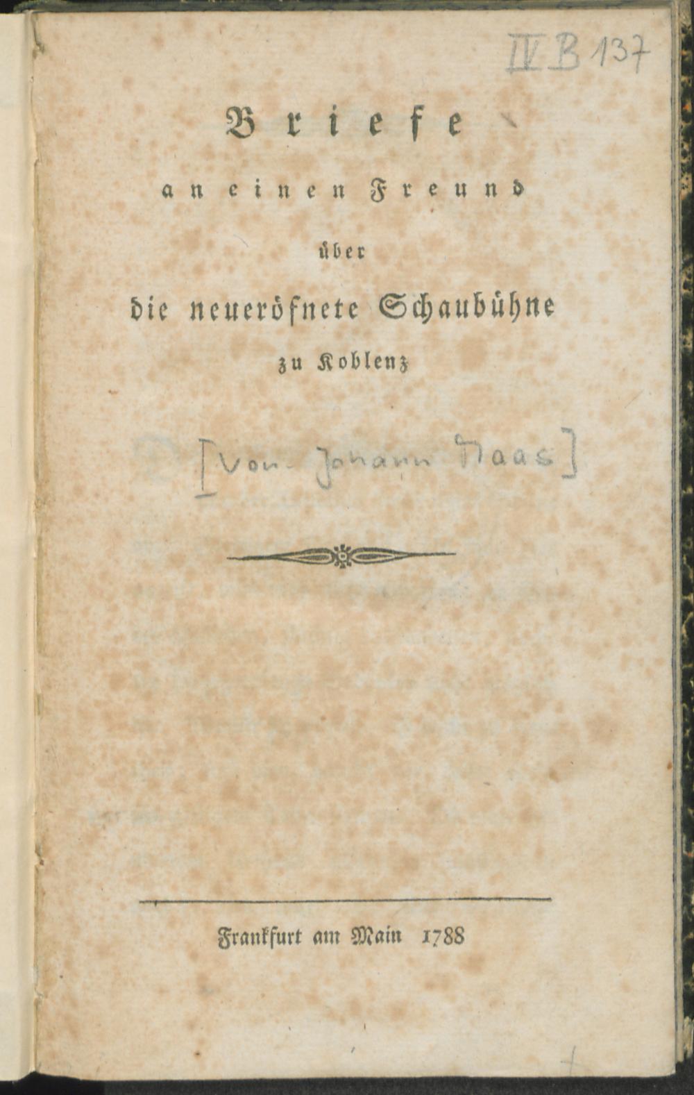 Briefe an einen Freund über die neueröfnete Schaubühne zu Koblenz