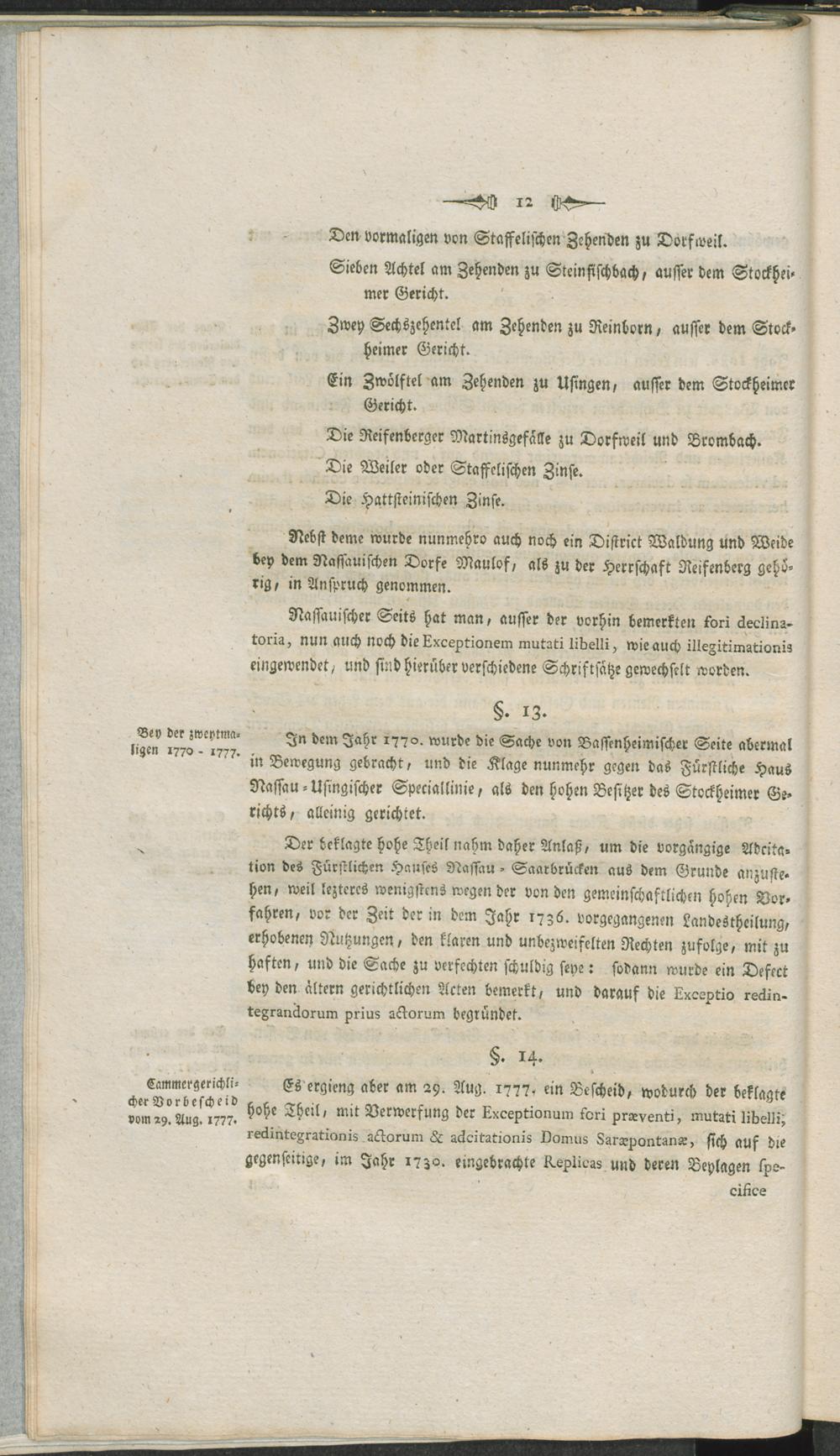 Summarische Darstellung derer Gründe, worauf es in der Klagsache des Herrn Grafen von Bassenheim gegen das Fürstliche Haus Nassau-Usingen die angesprochenen von Reifenbergischen Allodien in und zum Theil auch außer dem Stockheimer Gericht betreffend, dermal nachgesuchter Restitution des Beklagten hohen Theils annoch ankommt : nebst vorausgeschickter kurzer Geschichte des Stockheimer Gerichts, soweit solche zur Übersicht gegenwärtiger Sache nothwendig ist