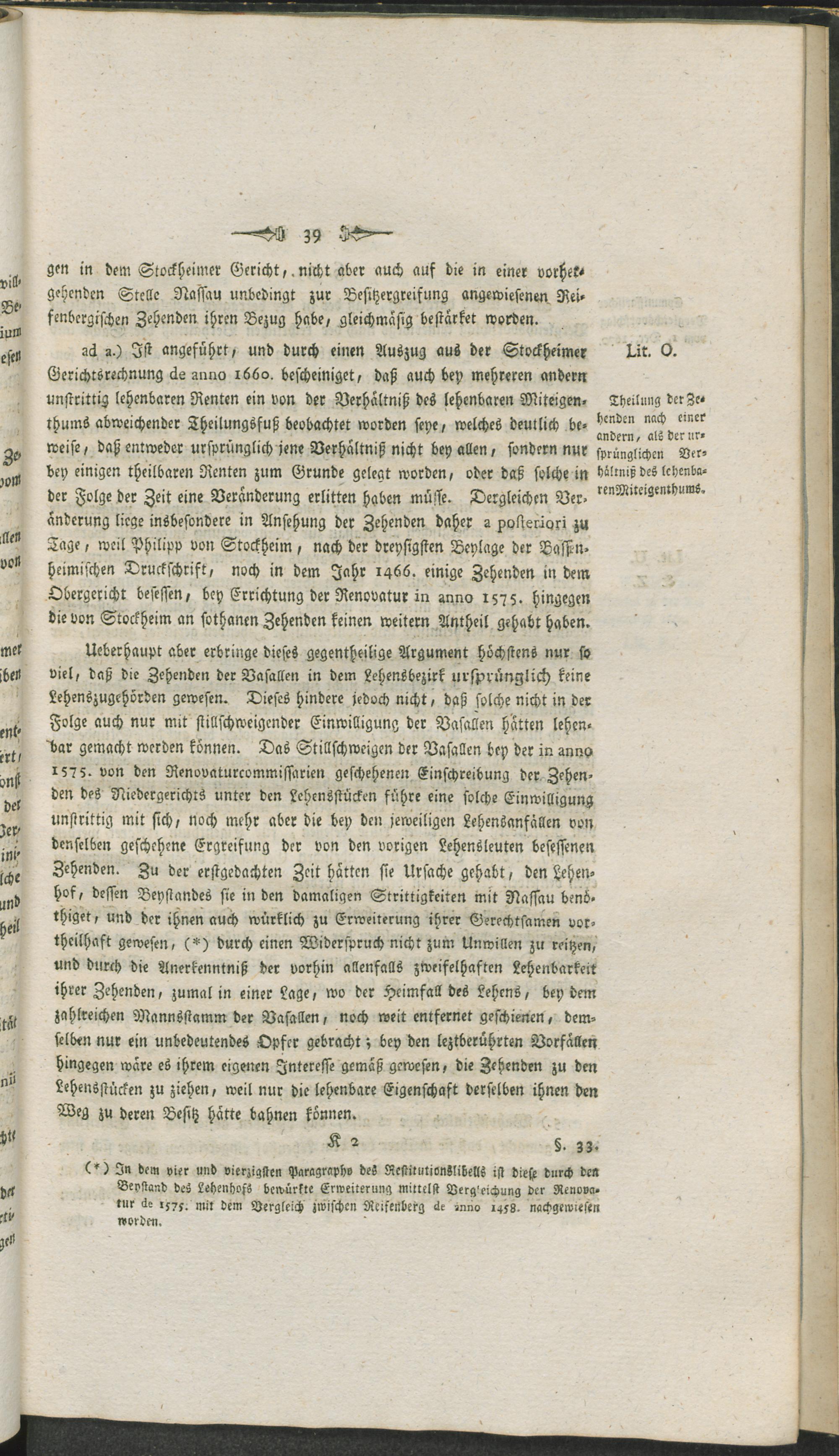 Summarische Darstellung derer Gründe, worauf es in der Klagsache des Herrn Grafen von Bassenheim gegen das Fürstliche Haus Nassau-Usingen die angesprochenen von Reifenbergischen Allodien in und zum Theil auch außer dem Stockheimer Gericht betreffend, dermal nachgesuchter Restitution des Beklagten hohen Theils annoch ankommt : nebst vorausgeschickter kurzer Geschichte des Stockheimer Gerichts, soweit solche zur Übersicht gegenwärtiger Sache nothwendig ist