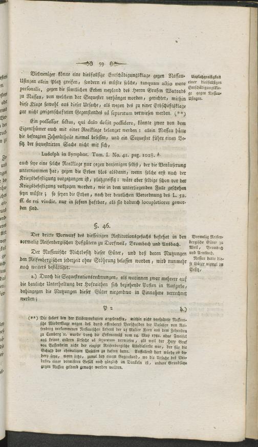 Summarische Darstellung derer Gründe, worauf es in der Klagsache des Herrn Grafen von Bassenheim gegen das Fürstliche Haus Nassau-Usingen die angesprochenen von Reifenbergischen Allodien in und zum Theil auch außer dem Stockheimer Gericht betreffend, dermal nachgesuchter Restitution des Beklagten hohen Theils annoch ankommt : nebst vorausgeschickter kurzer Geschichte des Stockheimer Gerichts, soweit solche zur Übersicht gegenwärtiger Sache nothwendig ist