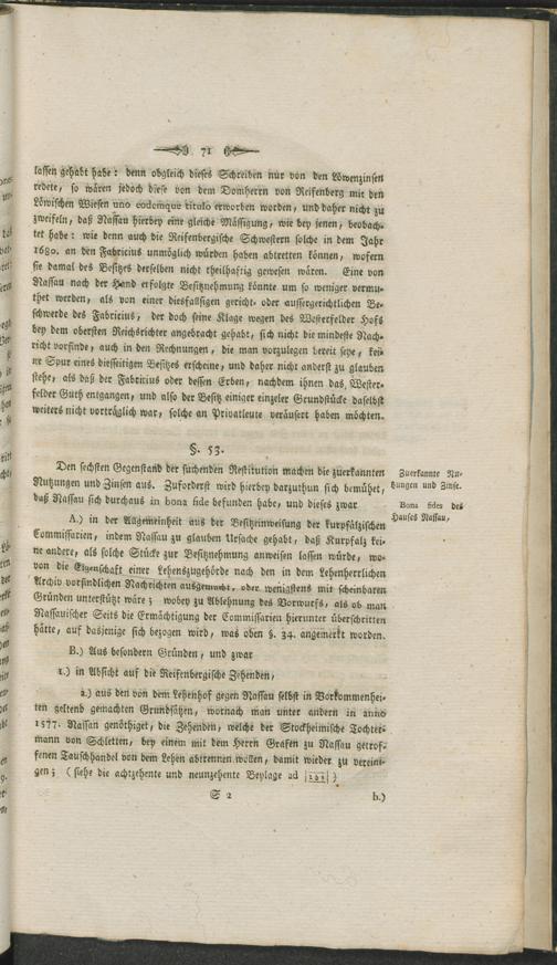 Summarische Darstellung derer Gründe, worauf es in der Klagsache des Herrn Grafen von Bassenheim gegen das Fürstliche Haus Nassau-Usingen die angesprochenen von Reifenbergischen Allodien in und zum Theil auch außer dem Stockheimer Gericht betreffend, dermal nachgesuchter Restitution des Beklagten hohen Theils annoch ankommt : nebst vorausgeschickter kurzer Geschichte des Stockheimer Gerichts, soweit solche zur Übersicht gegenwärtiger Sache nothwendig ist