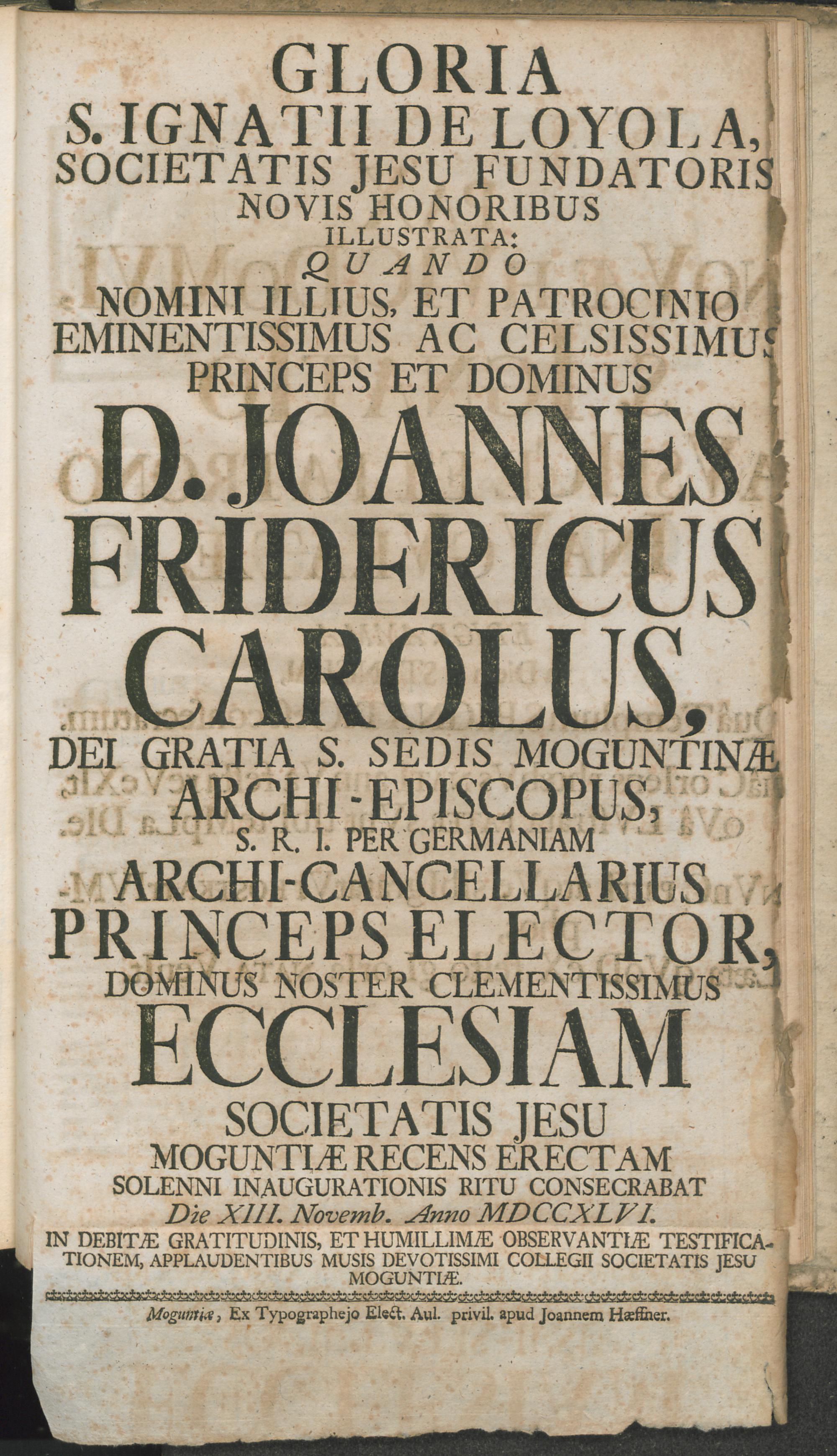 Gloria s. Ignatii de Loyola ..., quando ... Joannes Fridericus Carolus ... s. sedis Moguntinae archi-episcopus ... ecclesiam Societatis Jesu Moguntiae recens erectam ... consecrabat Die XIII. Novembr. Anno MDCCXLVI : ... applaudentibus musis devotissimi Collegii Societatis Jesu Moguntiae