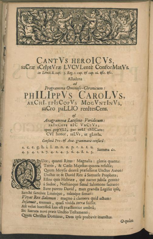 Avrea Mogvntia, avrigero decorata leone exvltat ... quo ... Philippus Carolus, ... sedis Moguntinae archi-episcopus ... consecrabatur et Pallio archi-episcopali decorabatur : anno 1732 die 16. Nov.