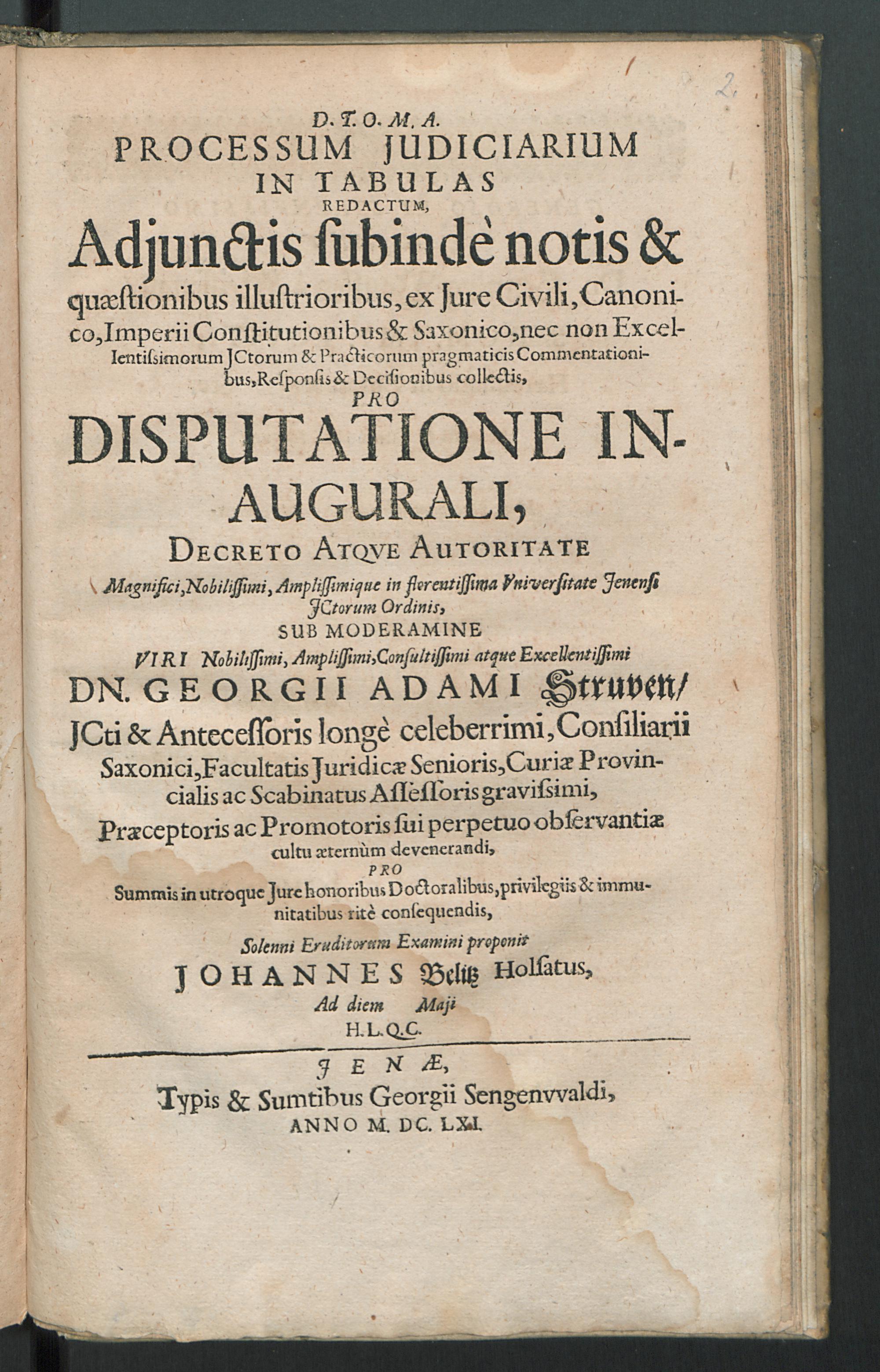D. T. O. M. A. Processum Judiciarium In Tabulas Redactum, Adjunctis subinde notis & quaestionibus illustrioribus, ex Jure Civili, Canonico, Imperii Constitutionibus & Saxonico, nec non Excellentissimorum JCtorum & Practicorum pragmaticis Commentationibus, Responsis & Decisionibus collectis, Pro Disputatione Inaugurali, Decreto Atqve Autoritate ... in florentissima Vniversitate Jenensi JCtorum Ordinis / Sub Moderamine ... Dn. Georgii Adami Struven ... Pro Summis in utroque Iure honoribus Doctoralibus, privilegiis & immunitatibus rite consequendis, Solenni Eruditorum Examini proponit Johannes Belitz Holsatus, Ad diem Maii H.L.Q.C.