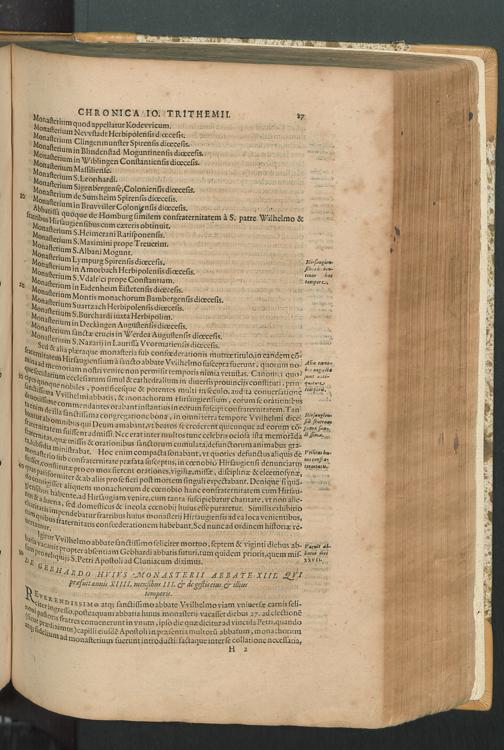 2 (1601) Iohannis Trithemii Spanheimensis Primo, Deinde D. Iacobi Maioris Apvd Herbipolin Abbatis, viri suo æuo doctissimi Secvndæ Partis Chronica Insignia Dvo : I. Coenobii Hirsavgiensis, Diœcesis Spirensis: eius fundationem & progressum ab Anno Christi DCCCXXX. vsque ad Annum MCCCLXX. II. Coenobii Spanheimensis, Diœcesis Moguntinensis: eius fundationem & progressum ab Anno Christi MCXXIIII. vsque ad Annum MDXXVI. vel potius res ab octo illis sæculis in tota Ecclesia & Imperio memorabiliter gestas, complectens; Qvorvm Privs Collatione Archetypi Ipsivs Auctoris manuscripti correctius & plenius; posterius verò istud nunc primùm è tenebris erutum, ob insignem vtilitatem optimâ fide in lucem editur; Accedunt Epistolæ eiusdem Familiares, ab excessu eius de cœnobio Spanheimensi ad Principes clarosque viros scriptæ, historiis eius æui referctæ