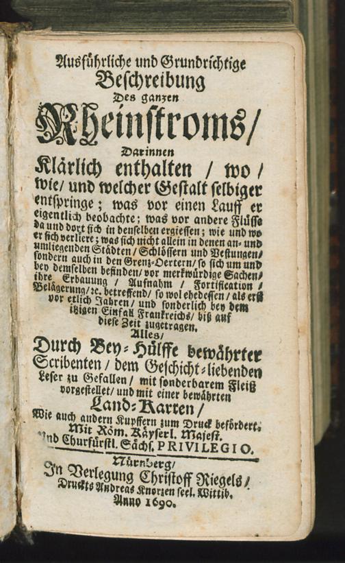 Ausführliche und Grundrichtige Beschreibung Des ganzen Rheinstroms/ Darinnen Klärlich enthalten/ wo/ wie/ und welcher Gestalt selbiger entspringe; ... : Durch Bey-Hülffe bewährter Scribenten/ ... mit einer bewährten Land-Karten/ Wie auch andern Kupffern zum Druck befördert / [Schneider, Caspar]