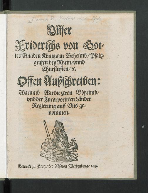 Vnser Friderichs von Gottes Gnaden K[oe]nigs in Beheimb/ Pfaltzgrafen bey Rhein/ vnnd Churf[ue]rsten/ [et]c. Offen Außschreiben: Warumb Wir die Cron B[oe]heimb/ vnd der Incorporirten L[ae]nder Regierung auff Vns genommen