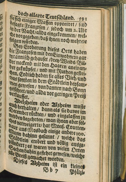 [1] (1689) Das Von Frankreich zwar verunruhigte doch dabey allarte Teutschland/ Oder Kurtze und warhaffte Vorstellung alles deßjenigen/ was von dem Einfall der Frantzösischen Armee in Teutschland am Rhein An. 1688. an/ bis in den Mertzen des 1689. Jahrs/ sich sowol in Ober- als Nieder-Teutschland Merk-würdiges zugetragen/ wie übel die Frantzosen allenthalben gehauset/ und aus unterschiedlichen Orten/ durch die Kayserliche/ Chur-Bayerische/ Chur-Sächsische und Chur-Brandenburgische Armeen verjaget worden ...