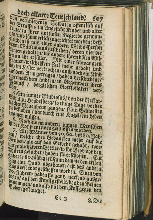 [1] (1689) Das Von Frankreich zwar verunruhigte doch dabey allarte Teutschland/ Oder Kurtze und warhaffte Vorstellung alles deßjenigen/ was von dem Einfall der Frantzösischen Armee in Teutschland am Rhein An. 1688. an/ bis in den Mertzen des 1689. Jahrs/ sich sowol in Ober- als Nieder-Teutschland Merk-würdiges zugetragen/ wie übel die Frantzosen allenthalben gehauset/ und aus unterschiedlichen Orten/ durch die Kayserliche/ Chur-Bayerische/ Chur-Sächsische und Chur-Brandenburgische Armeen verjaget worden ...