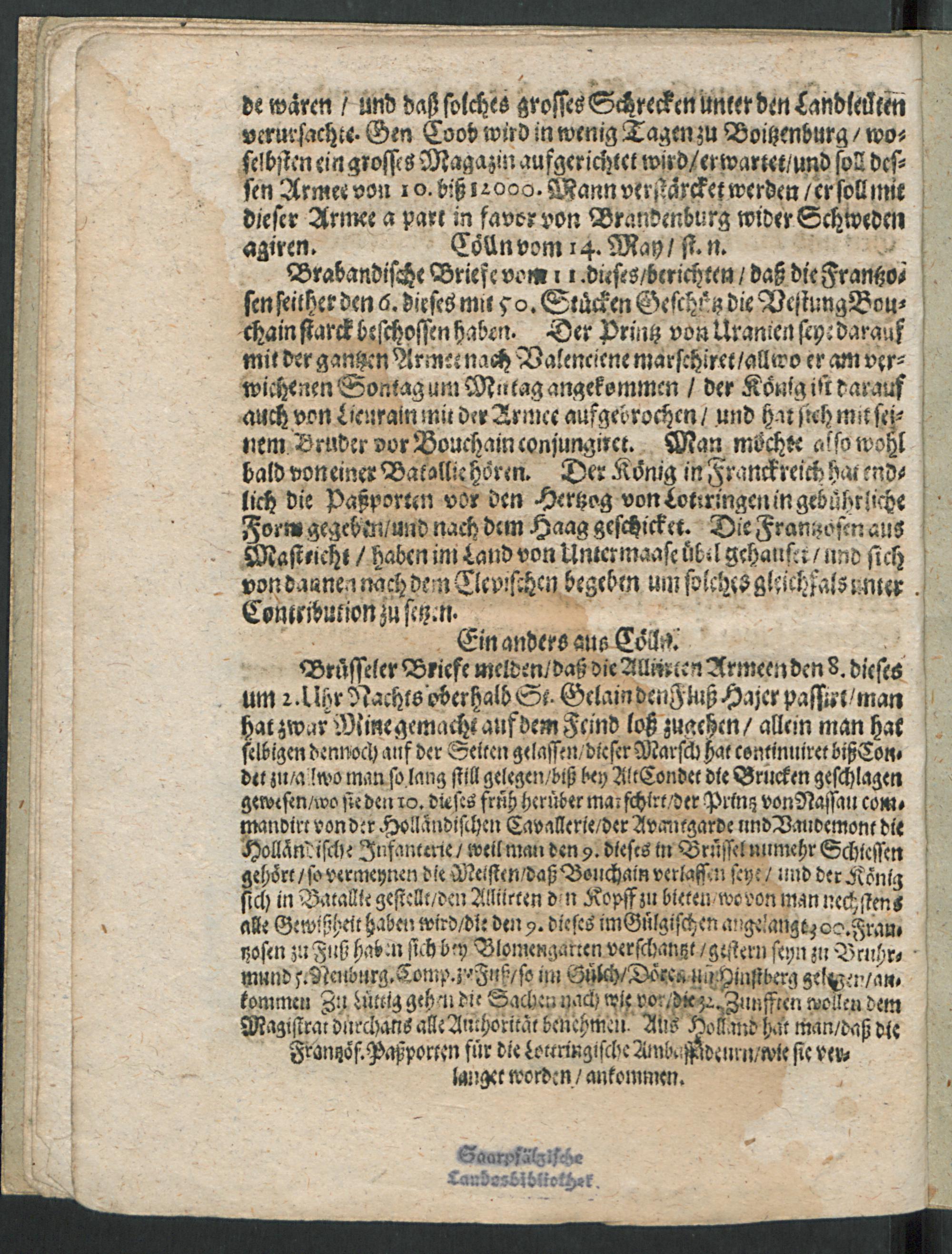 Der Kayserl. und Reichs-Völcker Seither Geschehenen Aufbruch/ Tapfere Verrichtungen : Sonderlich Was bey Eroberung der 2. Schantzen vor Philippsburg unter dem Commando Hrn. Obersten Graven von Zerini am 1. und 11. May/ und seither weiter fürgeloffen/ umständliche Erzählung/ mit beygefügten Bericht vom Niederländischen Zustand