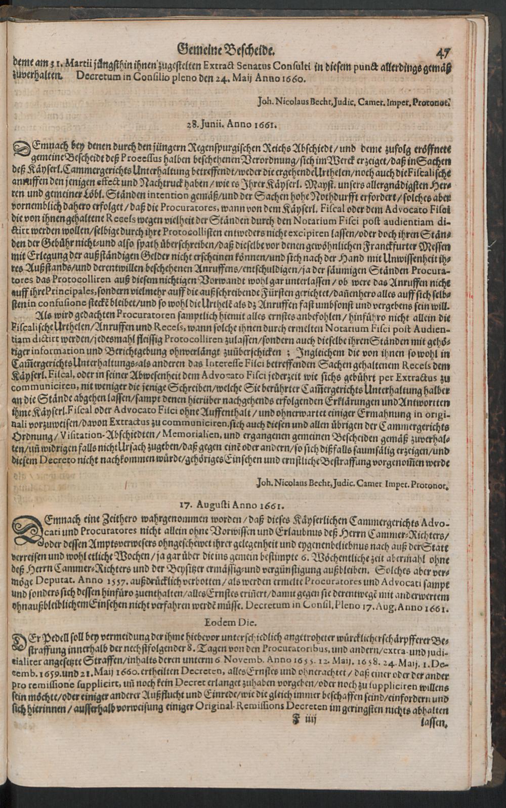 Gemeine Bescheide. Welche Bey dem Hochlöbl. Kaiserlichen Cammergericht/ von desselben Anfang biß auff den Monath Octobris Anno 1670. einschließlich/ so wohl inner: als ausserhalb Gerichts eröffnet : Sambt Einigen SCtis & Resolutionibus, und verschiedenen dem Pfenningmeister und Cammerpoten ertheilten: auch der Cameral Vormundschafften/ und der ahn dictirter Straffen halber ergangenen Decreten; und wegen deß Tax Chur Manitzische Verordnung ; Allen deß Cammer-Rechts beflissenen zum Besten in Truck verfertiget: Mit Deß Hochpreißlichen Cammergerichts erneuerter Gnädigster Bewilligung