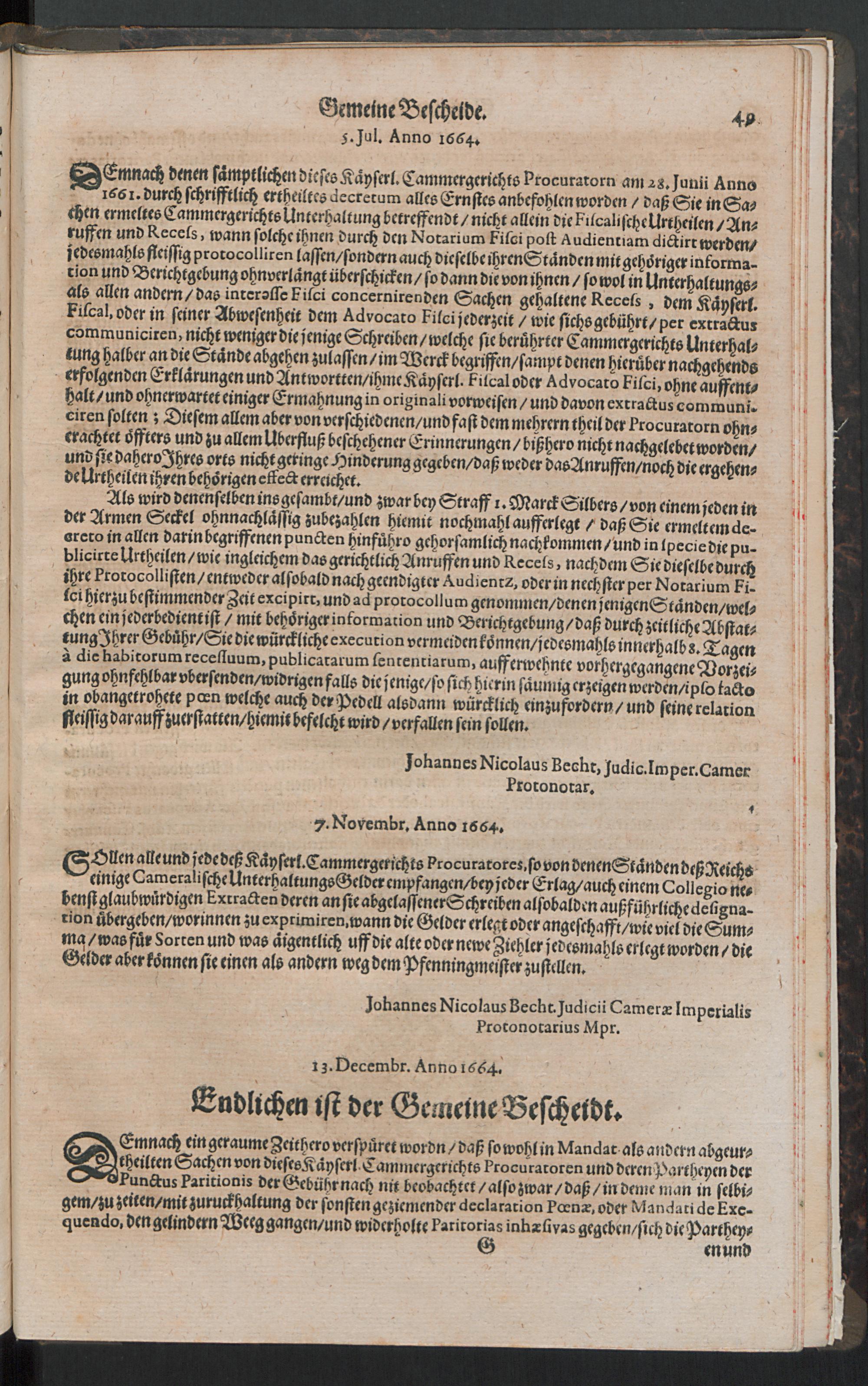 Gemeine Bescheide. Welche Bey dem Hochlöbl. Kaiserlichen Cammergericht/ von desselben Anfang biß auff den Monath Octobris Anno 1670. einschließlich/ so wohl inner: als ausserhalb Gerichts eröffnet : Sambt Einigen SCtis & Resolutionibus, und verschiedenen dem Pfenningmeister und Cammerpoten ertheilten: auch der Cameral Vormundschafften/ und der ahn dictirter Straffen halber ergangenen Decreten; und wegen deß Tax Chur Manitzische Verordnung ; Allen deß Cammer-Rechts beflissenen zum Besten in Truck verfertiget: Mit Deß Hochpreißlichen Cammergerichts erneuerter Gnädigster Bewilligung