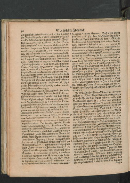 Chronica Der Freyen Reichs-Statt Speyer : Darinn von dreyerley fürnemblich gehandelt/ Erstlich vom Ursprung/ Auffnehmen/ Befreyung/ Beschaffenheit deß Regiments/ Freyheiten/ Privilegien/ Rechten/ Gerechtigkeiten/ denckwürdigen Sachen und Geschichten/ auch underschiedlichen Kriegen und Belägerungen der Statt Speyr: Zum andern/ von Anfang und Auffrichtung deß Teutschen Reichs/ desselben Regierung durch König und Kayser/ und was es jeder Zeit ins gemein mit demselben/ und insonders mit den Ehrbahren Frey und Reichs-Stätten vor Gestalt gehabt... Zum dritten/ von Anfang und Beschreibung der Bischoffen zu Speyr/ und deß Speyrischen Bisthumbs / Mit Fleiß zusammen getragen Durch Christophorum Lehmann