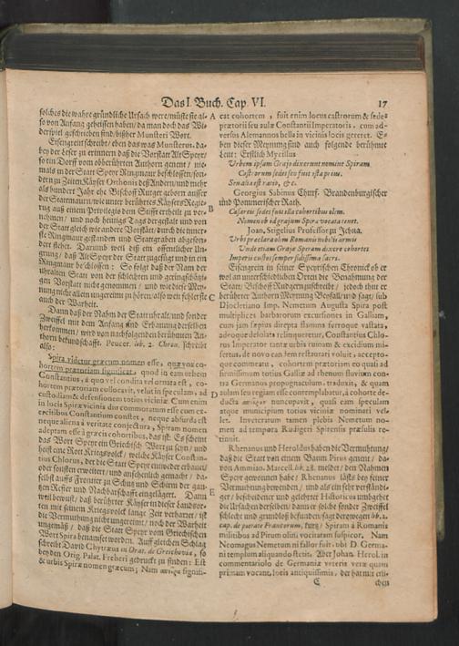 Chronica Der Freyen Reichs-Statt Speyer : Darinn von dreyerley fürnemblich gehandelt/ Erstlich vom Ursprung/ Auffnehmen/ Befreyung/ Beschaffenheit deß Regiments/ Freyheiten/ Privilegien/ Rechten/ Gerechtigkeiten/ denckwürdigen Sachen und Geschichten/ auch underschiedlichen Kriegen und Belägerungen der Statt Speyr: Zum andern/ von Anfang und Auffrichtung deß Teutschen Reichs/ desselben Regierung durch König und Kayser/ und was es jeder Zeit ins gemein mit demselben/ und insonders mit den Ehrbahren Frey und Reichs-Stätten vor Gestalt gehabt... Zum dritten/ von Anfang und Beschreibung der Bischoffen zu Speyr/ und deß Speyrischen Bisthumbs / Mit Fleiß zusammen getragen Durch Christophorum Lehmann