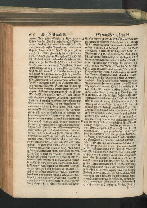 Chronica Der Freyen Reichs-Statt Speyer : Darinn von dreyerley fürnemblich gehandelt/ Erstlich vom Ursprung/ Auffnehmen/ Befreyung/ Beschaffenheit deß Regiments/ Freyheiten/ Privilegien/ Rechten/ Gerechtigkeiten/ denckwürdigen Sachen und Geschichten/ auch underschiedlichen Kriegen und Belägerungen der Statt Speyr: Zum andern/ von Anfang und Auffrichtung deß Teutschen Reichs/ desselben Regierung durch König und Kayser/ und was es jeder Zeit ins gemein mit demselben/ und insonders mit den Ehrbahren Frey und Reichs-Stätten vor Gestalt gehabt... Zum dritten/ von Anfang und Beschreibung der Bischoffen zu Speyr/ und deß Speyrischen Bisthumbs / Mit Fleiß zusammen getragen Durch Christophorum Lehmann