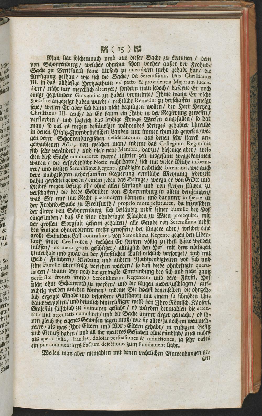 Warhaffter Status Causae und rechtliche Deduction derer Gründe, vermög welcher das jetzt-regierende Hochfürstl. Hauß Pfaltz-Zweybrücken behauptet/ daß die beyde Frey-Herren von Schorrenburg ... mit jhrem ... weitern ... Restitutions-Gesuch ... à Limine Judicii abzuweisen seyen : Mit Beylagen à Num. 1. usque 117. inclusive