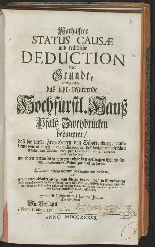 Warhaffter Status Causae und rechtliche Deduction derer Gründe, vermög welcher das jetzt-regierende Hochfürstl. Hauß Pfaltz-Zweybrücken behauptet/ daß die beyde Frey-Herren von Schorrenburg ... mit jhrem ... weitern ... Restitutions-Gesuch ... à Limine Judicii abzuweisen seyen : Mit Beylagen à Num. 1. usque 117. inclusive