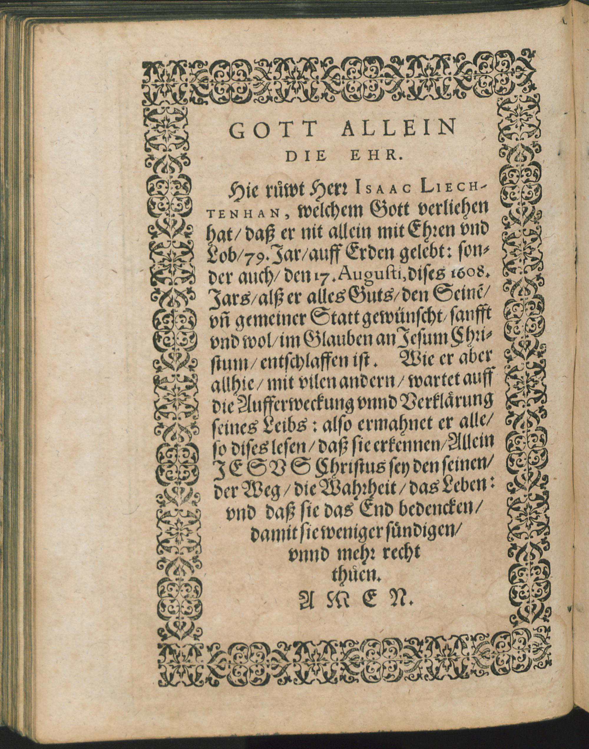 Von der Wahre[n] Christen vnzweiffenlichen Hoffnung ihrer Aufferstehung von Todten : Ein Predig/ Die/ zu Basel/ im Münster/ den 19. Augusti, diß 1608. Jahrs/ bey der Bestattung/ weiland des ... Herrn Isaac Liechtenhans / gehalten ist worden/ Durch Ioan: Iacob: Grynaeum