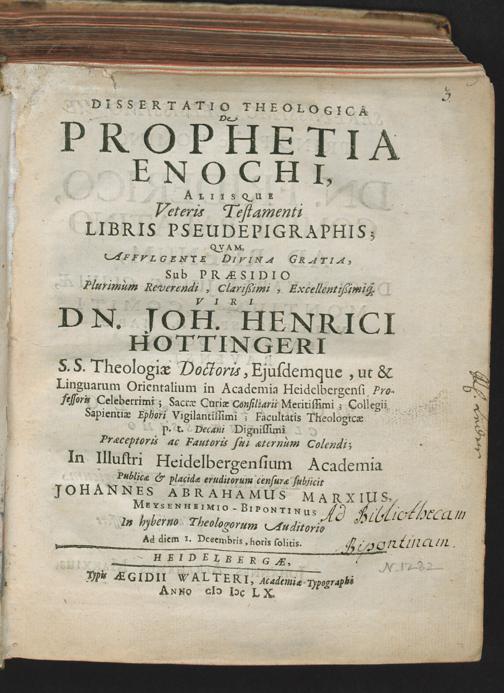 Dissertatio Theologica De Prophetia Enochi, Aliisque Veteris Testamenti Libris Pseudepigraphis / Quam ... Sub Praesidio ... Viri Dn. Joh. Henrici Hottingeri S.S. Theologiae Doctoris, Ejusdemque, ut & Linguarum Orientalium in Academia Heidelbergensi Professoris Celeberrimi ... In Illustri Heidelbergensium Academia Publicae & placideae eruditorum censurae subjicit Johannes Abrahamus Marxius, Meysenheimio-Bipontinus in hyberno Theologorum Auditorio Ad diem 1. Decembris, horis solitis