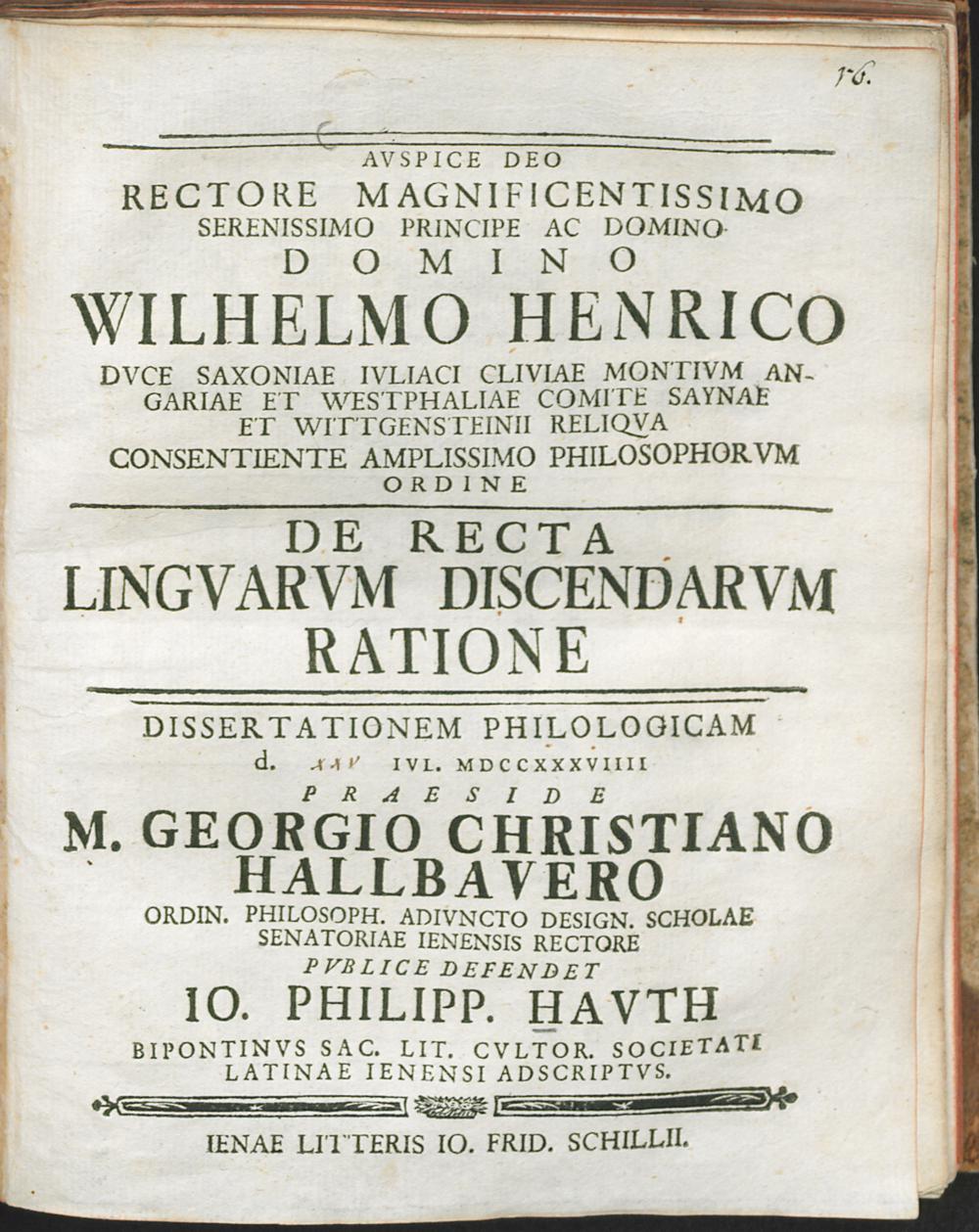 Avspice Deo Rectore Magnificentissimo Serenissimo Principe Ac Domino Domino Wilhelmo Henrico Dvce Saxoniae ... Consentiente Amplissimo Philosophorvm Ordine De Recta Lingvarvm Discendarvm Ratione Dissertationem Philologicam d. [ ] IVI. MDCCXXXVIIII / Praeside M. Georgio Christiano Hallbavero Ordin. Philosoph. Adivncto Design. Scholae Senatoriae Ienensis Rectore Pvblice Defendet Io. Philipp. Havth Bipontinvs Sac. Lit. Cvltor. Societati Latinae Ienensis Adscriptvs