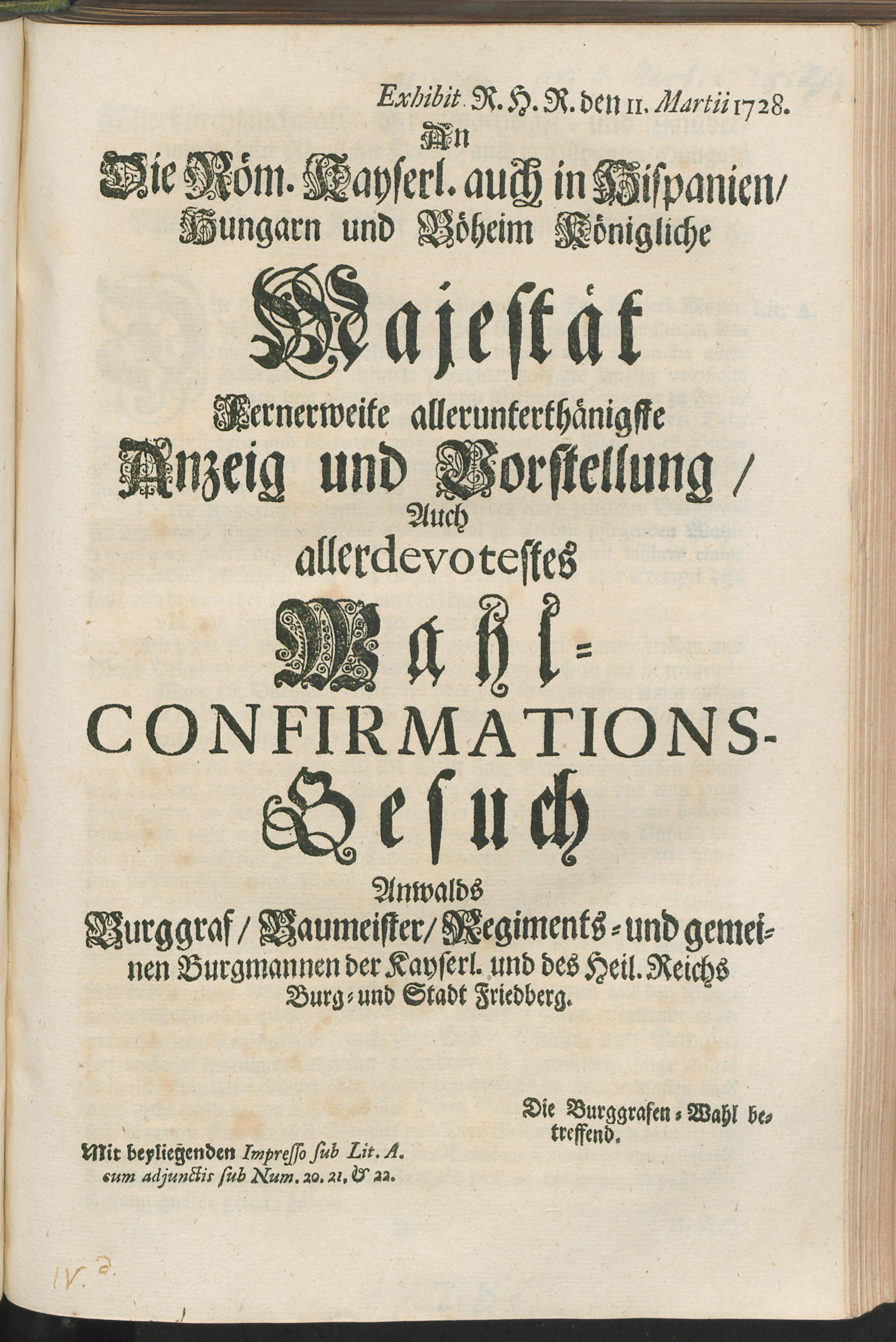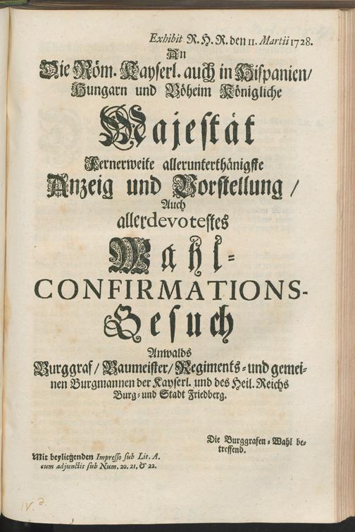 An Die Röm. Kayserl. auch in Hispanien, Hungarn und Böheim Königliche Majestät Fernerweite allerunterthänigste Anzeig und Vorstellung, Auch allerdevotestes Wahl-Confirmations-Gesuch : Anwalds Burggraf Baumeister Regiments- und gemeinen Burgmannen der Kayserl. und des Heil. Reichs Burg und Stadt Friedberg ; Die Burggrafen-Wahl betreffend / [Schlegel]