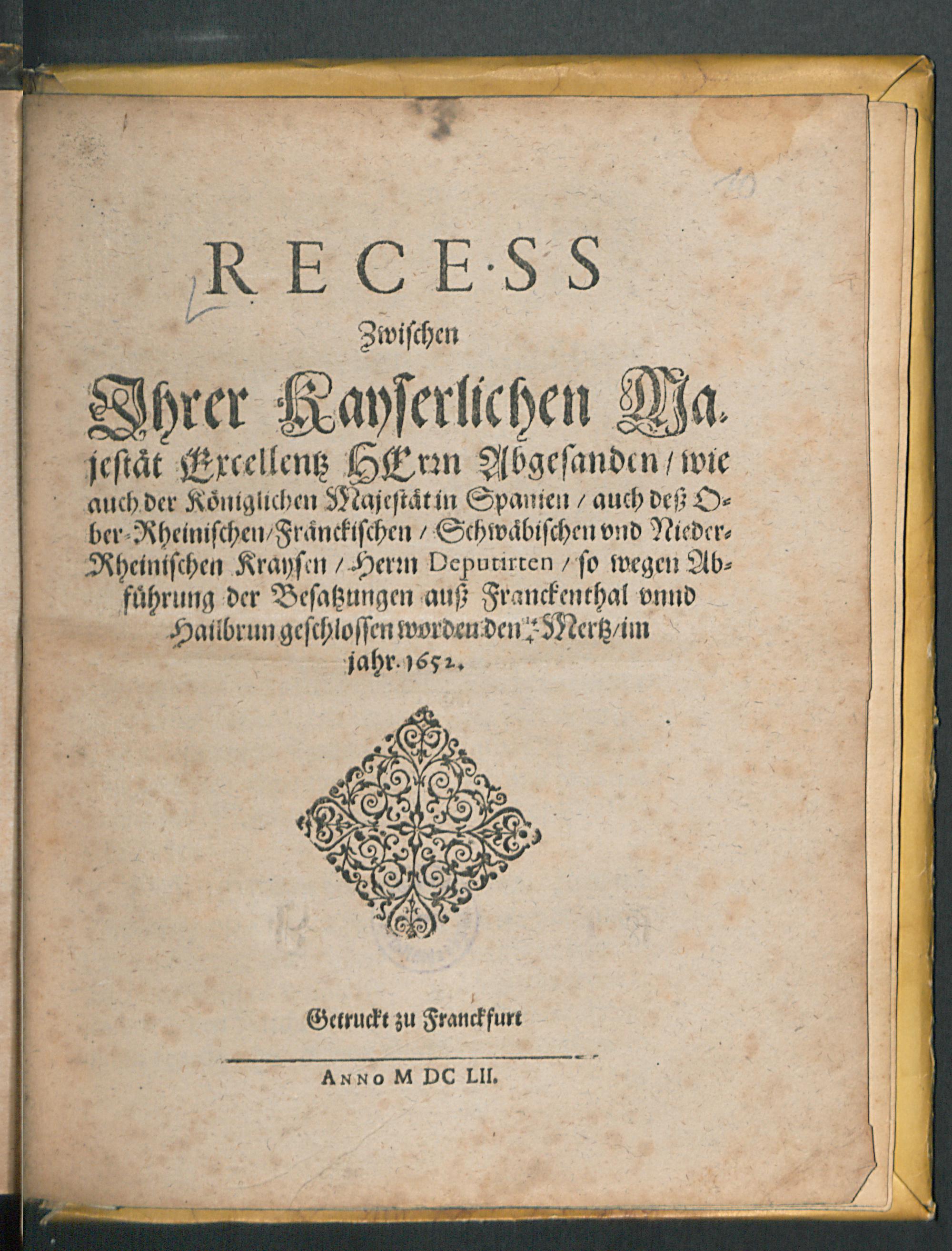 Recess Zwischen Ihrer Kayserlichen Majestät Excellentz Herrn Abgesanden/ wie auch der Königlichen Majestät in Spanien/ auch deß Ober-Rheinischen/ Fränckischen/ Schwäbischen vnd Nieder-Rheinischen Kraysen/ Herrn Deputirten/ so wegen Abführung der Besatzungen auß Franckenthal vnnd Hailbrun geschlossen worden den 14/4 Mertz/ im jahr. 1652