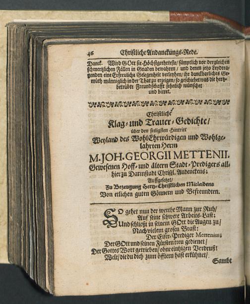 Ecclesiastes Corroboratus das ist/ Der gestärckte Prediger : Als ... Der ... Herr M. Joh. Georg Mettenius/ Fürstl. Hessischer ... Hoff- und älterer Stadt-Prediger/ auch Definitor des ... Synodi allhie zu Darmstadt/ Den 31ten Ianuarii dieses jetztlauffenden 1691ten Jahrs ... entschlaffen/ und darauff den 4. Febr. besagten Jahrs dessen ... Cörper ... in die hiesige Kirchhoffs-Capell ... begraben wurde/ In einer Christl. Leich-Predigt vorgestellt und ... zum Druck gegeben / von M. Johann Otto Gorrn/ Predigern daselbst