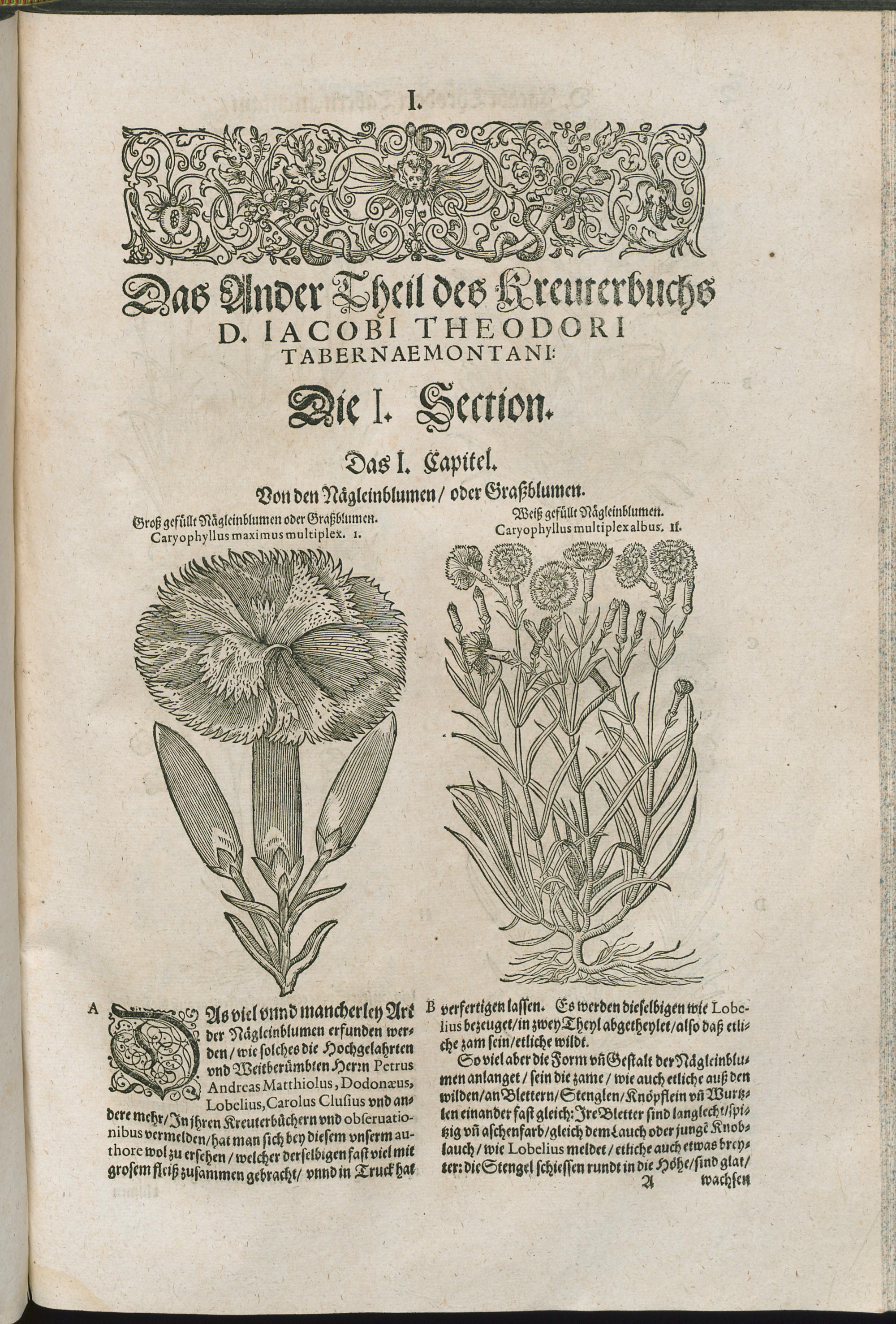 2/3 (1591) D. IACOBI THEODORI || TABERNAEMONTANI || Neuw/ vnd volkommenlich || Kreuterbuch/|| Mit schönen/ künstlichen vnd leblichen Fi=||guren vnnd Conterfeyten/ allerhandt frembder vnd einheymischer || Gewächß/ Kreuter/ Blumen/ Stauden/ Hecken/ Bäume/ auch köstlicher außländischer || Wurtzeln/ Rinden/ Früchten ... || dergleichen vormals nie ans Liecht oder in || Truck kommen.|| Das Ander Theyl.|| ...