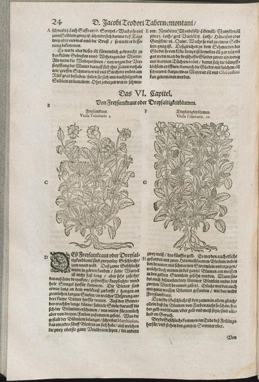 2/3 (1591) D. IACOBI THEODORI || TABERNAEMONTANI || Neuw/ vnd volkommenlich || Kreuterbuch/|| Mit schönen/ künstlichen vnd leblichen Fi=||guren vnnd Conterfeyten/ allerhandt frembder vnd einheymischer || Gewächß/ Kreuter/ Blumen/ Stauden/ Hecken/ Bäume/ auch köstlicher außländischer || Wurtzeln/ Rinden/ Früchten ... || dergleichen vormals nie ans Liecht oder in || Truck kommen.|| Das Ander Theyl.|| ...