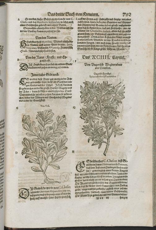 2/3 (1591) D. IACOBI THEODORI || TABERNAEMONTANI || Neuw/ vnd volkommenlich || Kreuterbuch/|| Mit schönen/ künstlichen vnd leblichen Fi=||guren vnnd Conterfeyten/ allerhandt frembder vnd einheymischer || Gewächß/ Kreuter/ Blumen/ Stauden/ Hecken/ Bäume/ auch köstlicher außländischer || Wurtzeln/ Rinden/ Früchten ... || dergleichen vormals nie ans Liecht oder in || Truck kommen.|| Das Ander Theyl.|| ...