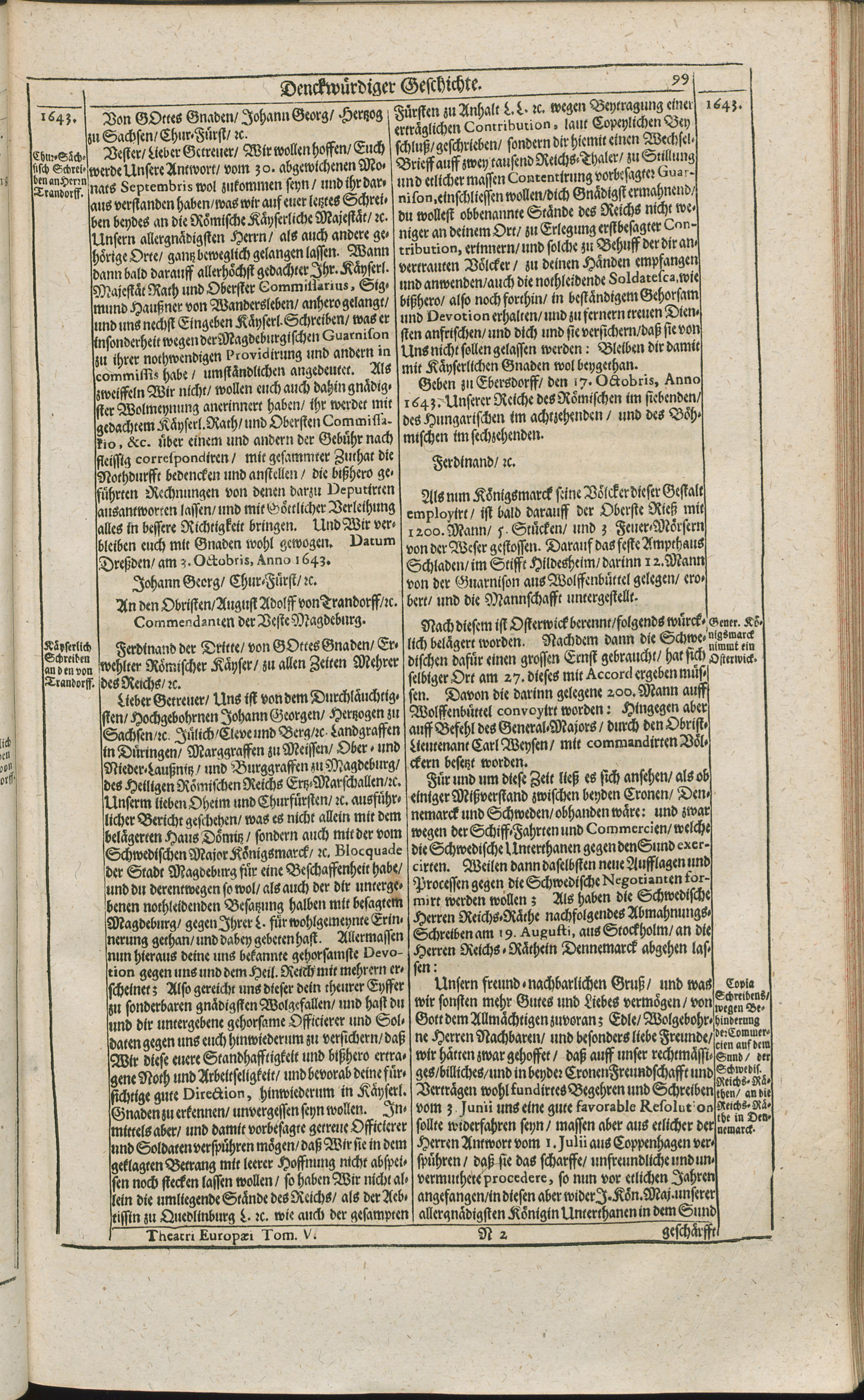 Theatri Europaei Fünffter Theil/ Das ist: Außführliche Beschreibung Aller Denckwürdigen Geschichten/ Die sich in Europa, Als Hoch- und Nieder-Teutschland/ Franckreich/ Hispanien/ Jtalien/ Groß-Britannien/ Dennemarck/ Schweden/ Polen/ Moscaw/ Böhmen/ Hungarn/ Siebenbürgen/ Wallachey/ Moldaw: Jn der Türckey und Barbarey ... vom Jahr 1643. biß ins 1647. Jahr/ allerseits begeben und verlauffen / [Johann Peter Lotichius]