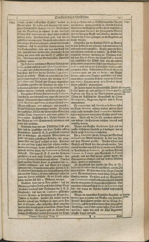 Theatri Europaei Fünffter Theil/ Das ist: Außführliche Beschreibung Aller Denckwürdigen Geschichten/ Die sich in Europa, Als Hoch- und Nieder-Teutschland/ Franckreich/ Hispanien/ Jtalien/ Groß-Britannien/ Dennemarck/ Schweden/ Polen/ Moscaw/ Böhmen/ Hungarn/ Siebenbürgen/ Wallachey/ Moldaw: Jn der Türckey und Barbarey ... vom Jahr 1643. biß ins 1647. Jahr/ allerseits begeben und verlauffen / [Johann Peter Lotichius]