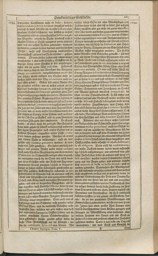 Theatri Europaei Fünffter Theil/ Das ist: Außführliche Beschreibung Aller Denckwürdigen Geschichten/ Die sich in Europa, Als Hoch- und Nieder-Teutschland/ Franckreich/ Hispanien/ Jtalien/ Groß-Britannien/ Dennemarck/ Schweden/ Polen/ Moscaw/ Böhmen/ Hungarn/ Siebenbürgen/ Wallachey/ Moldaw: Jn der Türckey und Barbarey ... vom Jahr 1643. biß ins 1647. Jahr/ allerseits begeben und verlauffen / [Johann Peter Lotichius]