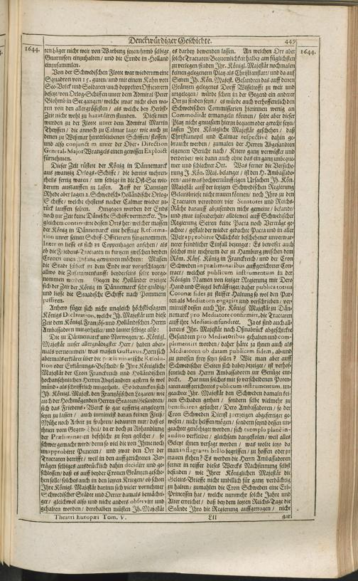 Theatri Europaei Fünffter Theil/ Das ist: Außführliche Beschreibung Aller Denckwürdigen Geschichten/ Die sich in Europa, Als Hoch- und Nieder-Teutschland/ Franckreich/ Hispanien/ Jtalien/ Groß-Britannien/ Dennemarck/ Schweden/ Polen/ Moscaw/ Böhmen/ Hungarn/ Siebenbürgen/ Wallachey/ Moldaw: Jn der Türckey und Barbarey ... vom Jahr 1643. biß ins 1647. Jahr/ allerseits begeben und verlauffen / [Johann Peter Lotichius]