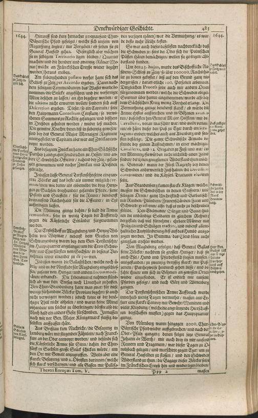 Theatri Europaei Fünffter Theil/ Das ist: Außführliche Beschreibung Aller Denckwürdigen Geschichten/ Die sich in Europa, Als Hoch- und Nieder-Teutschland/ Franckreich/ Hispanien/ Jtalien/ Groß-Britannien/ Dennemarck/ Schweden/ Polen/ Moscaw/ Böhmen/ Hungarn/ Siebenbürgen/ Wallachey/ Moldaw: Jn der Türckey und Barbarey ... vom Jahr 1643. biß ins 1647. Jahr/ allerseits begeben und verlauffen / [Johann Peter Lotichius]