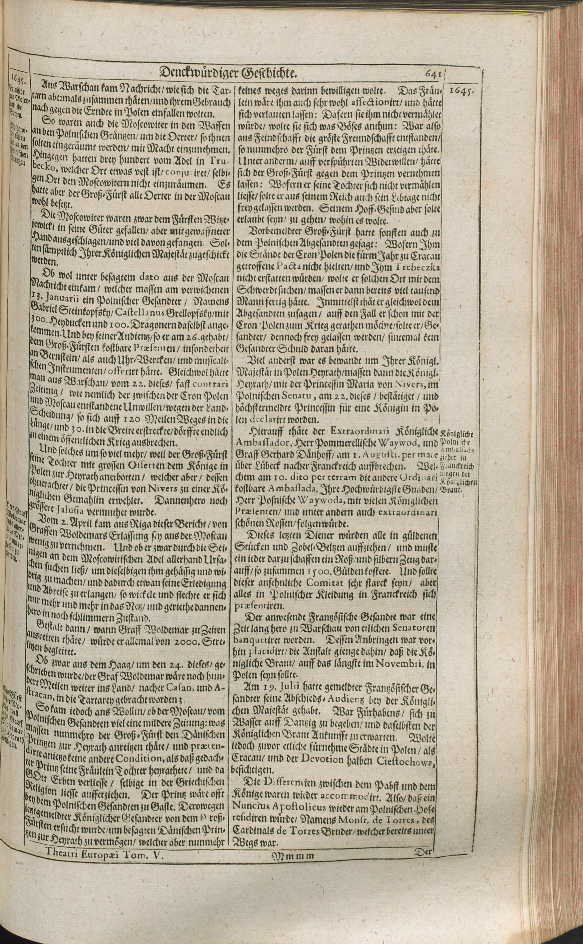 Theatri Europaei Fünffter Theil/ Das ist: Außführliche Beschreibung Aller Denckwürdigen Geschichten/ Die sich in Europa, Als Hoch- und Nieder-Teutschland/ Franckreich/ Hispanien/ Jtalien/ Groß-Britannien/ Dennemarck/ Schweden/ Polen/ Moscaw/ Böhmen/ Hungarn/ Siebenbürgen/ Wallachey/ Moldaw: Jn der Türckey und Barbarey ... vom Jahr 1643. biß ins 1647. Jahr/ allerseits begeben und verlauffen / [Johann Peter Lotichius]